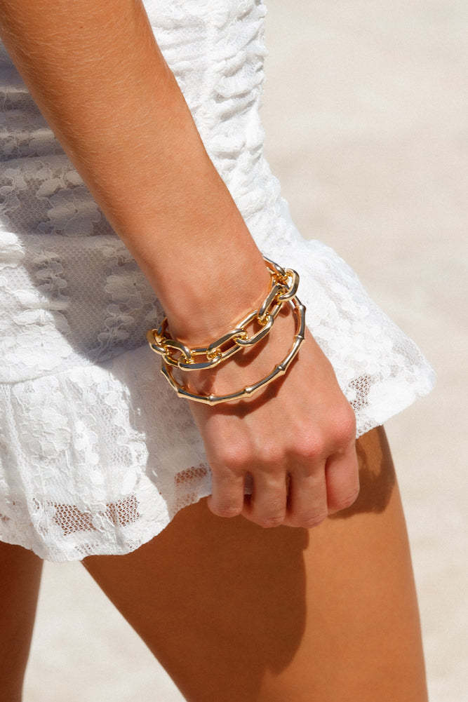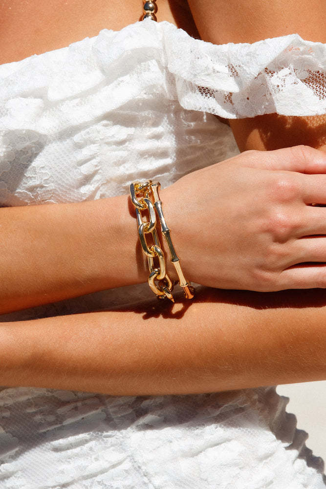 These sparkly adornments will complete any bottomless brunch edit! Our Dynasty Dreams Bracelets feature a bamboo-themed bangle with a contrasting chunky cable-chain bracelet. A must-have for babes who love the finer things in life!