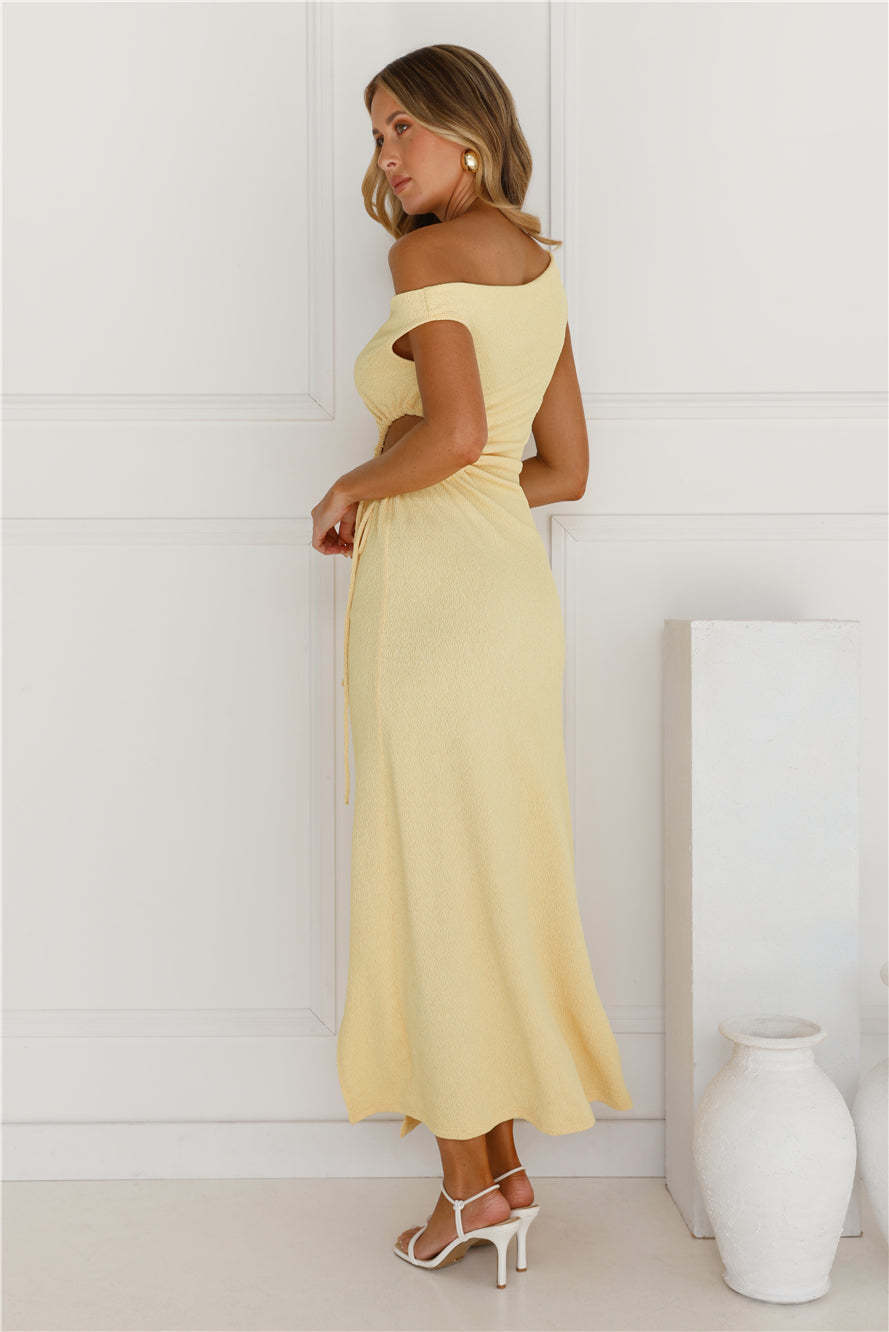 Vacay in style with the Exotic Escape Off Shoulder Maxi Dress. Featuring a cut-out to the waist with a wrap skirt and tie design. Style with slides and beachy waves.