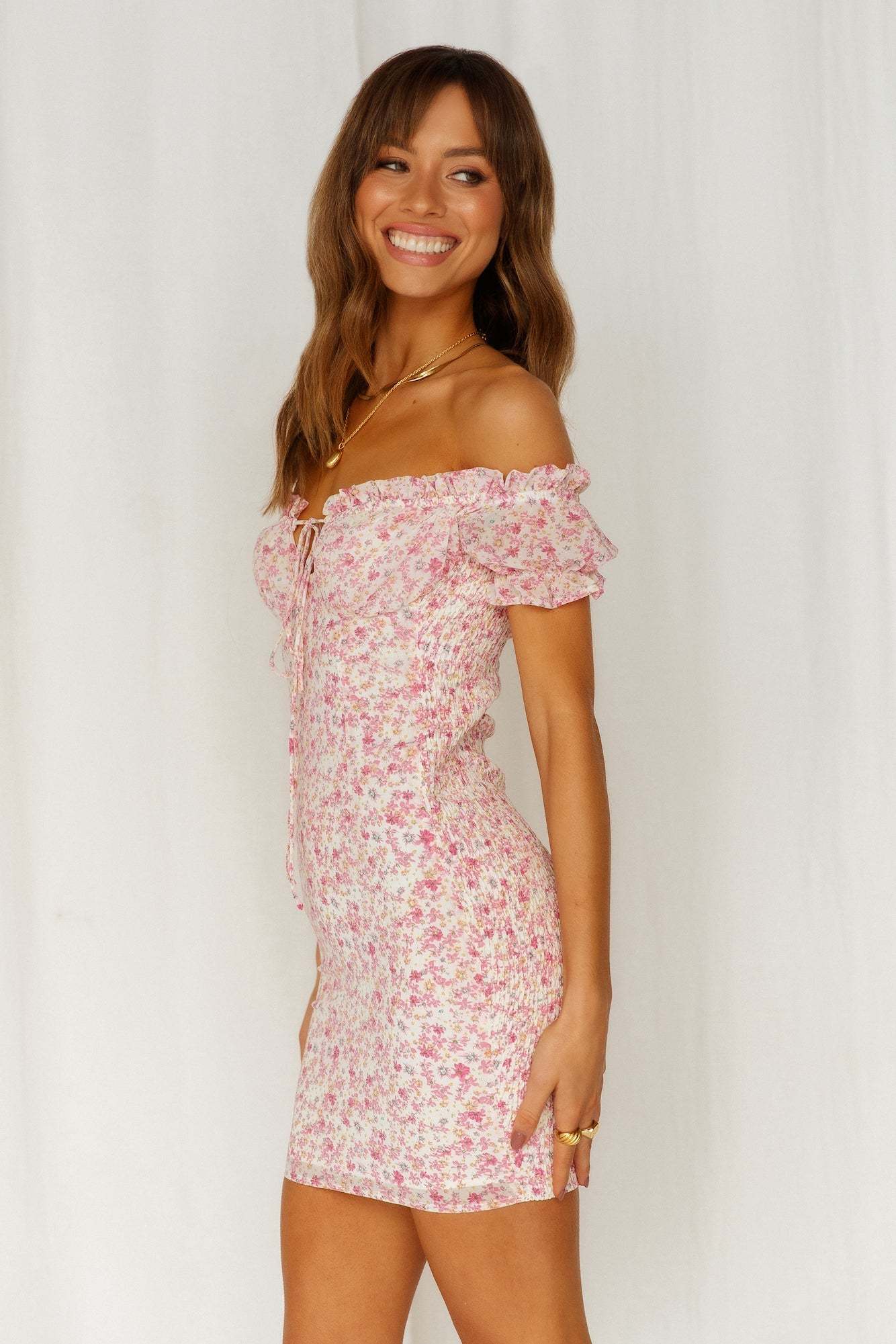 Grab that picnic basket. and those cute little sandwiches because it's time to live out your Flower Dreams. This adorable mini has ruching all the way down the back. making it super bodycon and very flattering. Coupled with the cap sleeves and a soft tie-up Queen Anne neckline. Style yours with strappy heels and dainty jewellery.