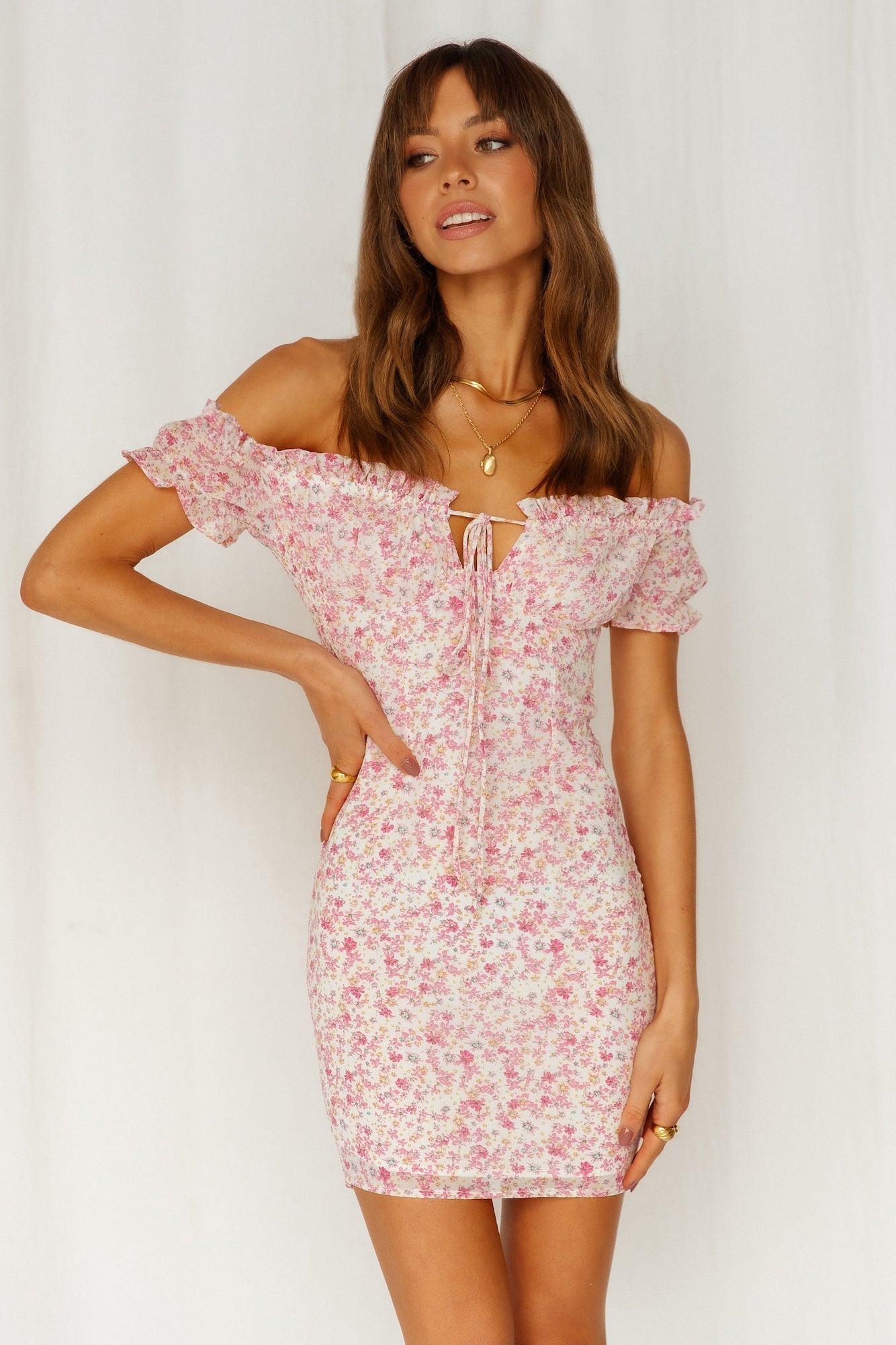 - Pink floral printed dress.