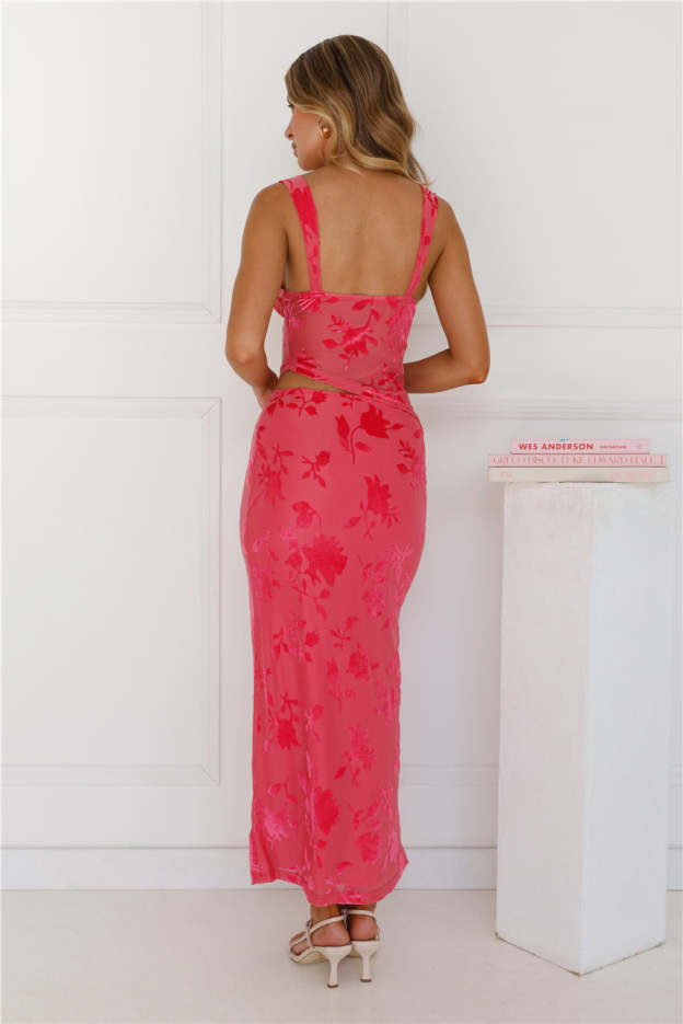She's gorgeous! The Garden Grove Maxi Skirt features a straight. flowy silhouette. a velvet-like pattern and a slip on design. Style with the matching top for a stylish 'fit we can't get enough of.