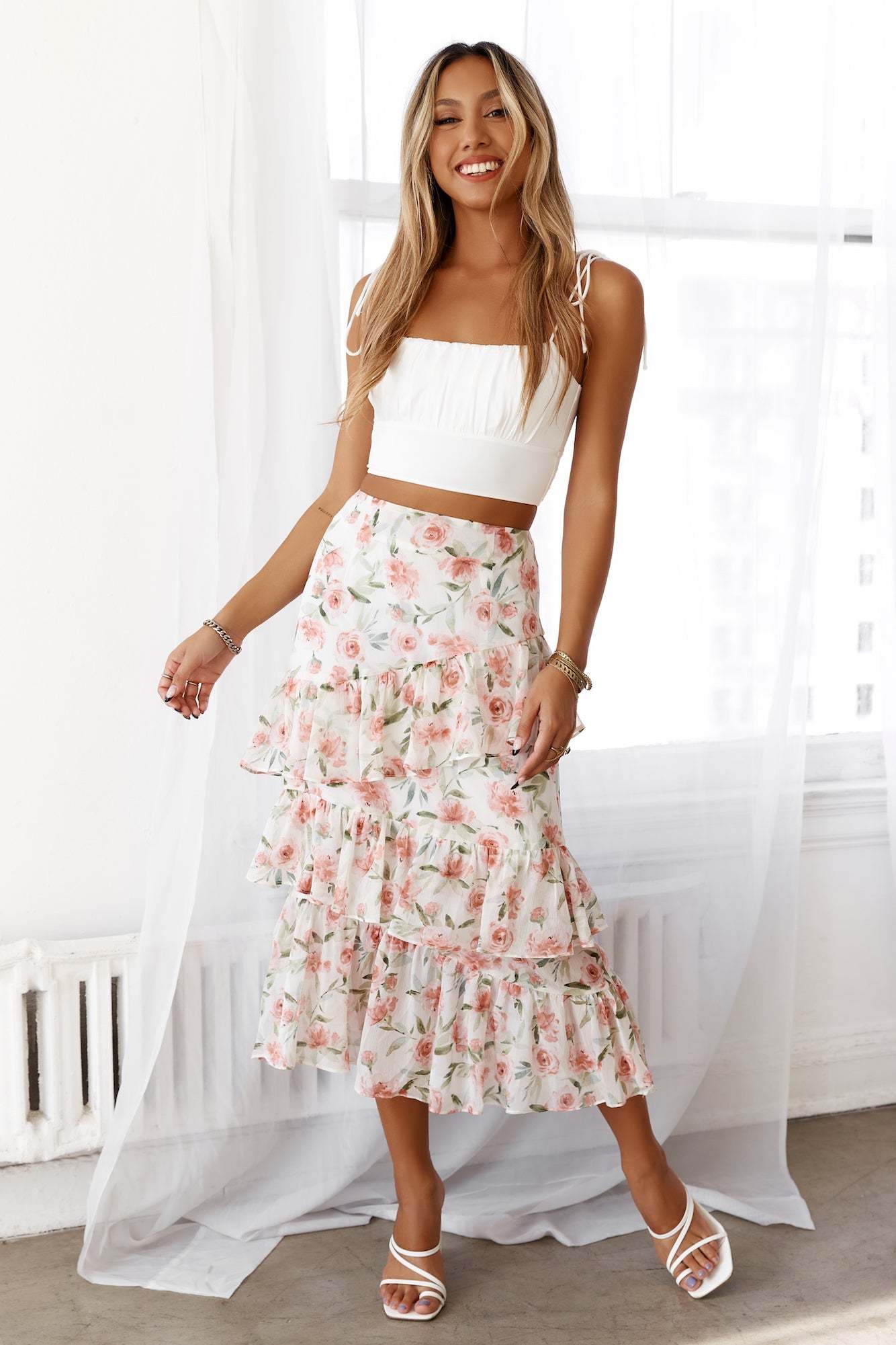 Wonder down Florence Boulevarde in this stunning maxi. This springtime babe features ruffled tiers all over - completed with a FAB floral print. Style yours with a crop and mules.