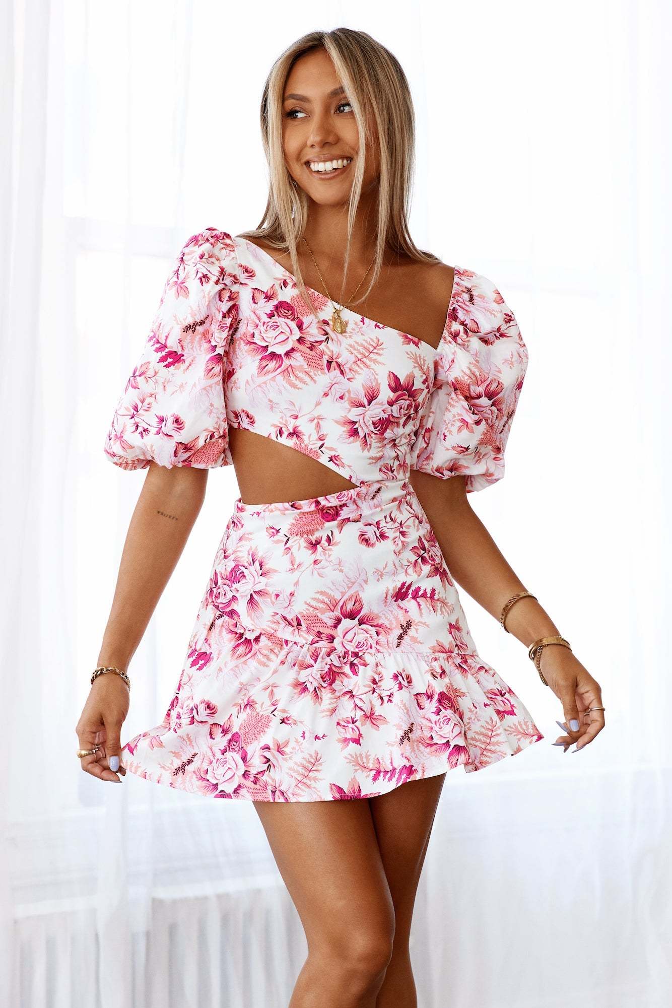 Live out all of your wildest dreams in this floral dream of a fit. Our exclusive Sweetest Kind Dress will make sure that everyone remembers you standing in a dress glowing in the sunset. The mini has a slash neckline. a trendy cut-out on the side. puffy sleeves and a flared out skirt - cuteness! Style yours with small heels and soft waves.
