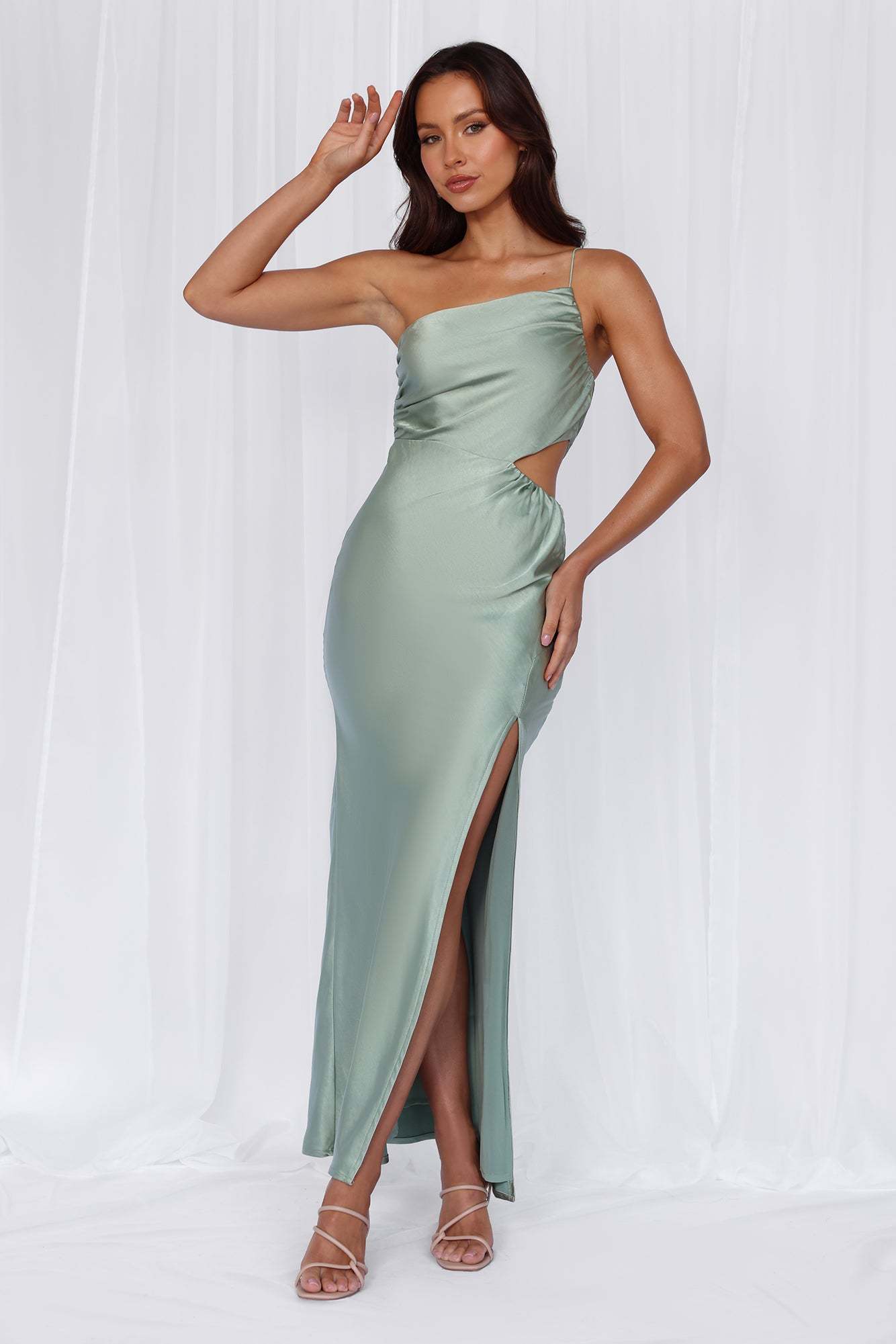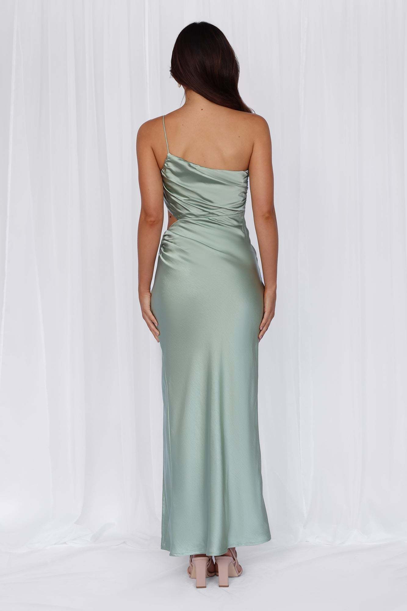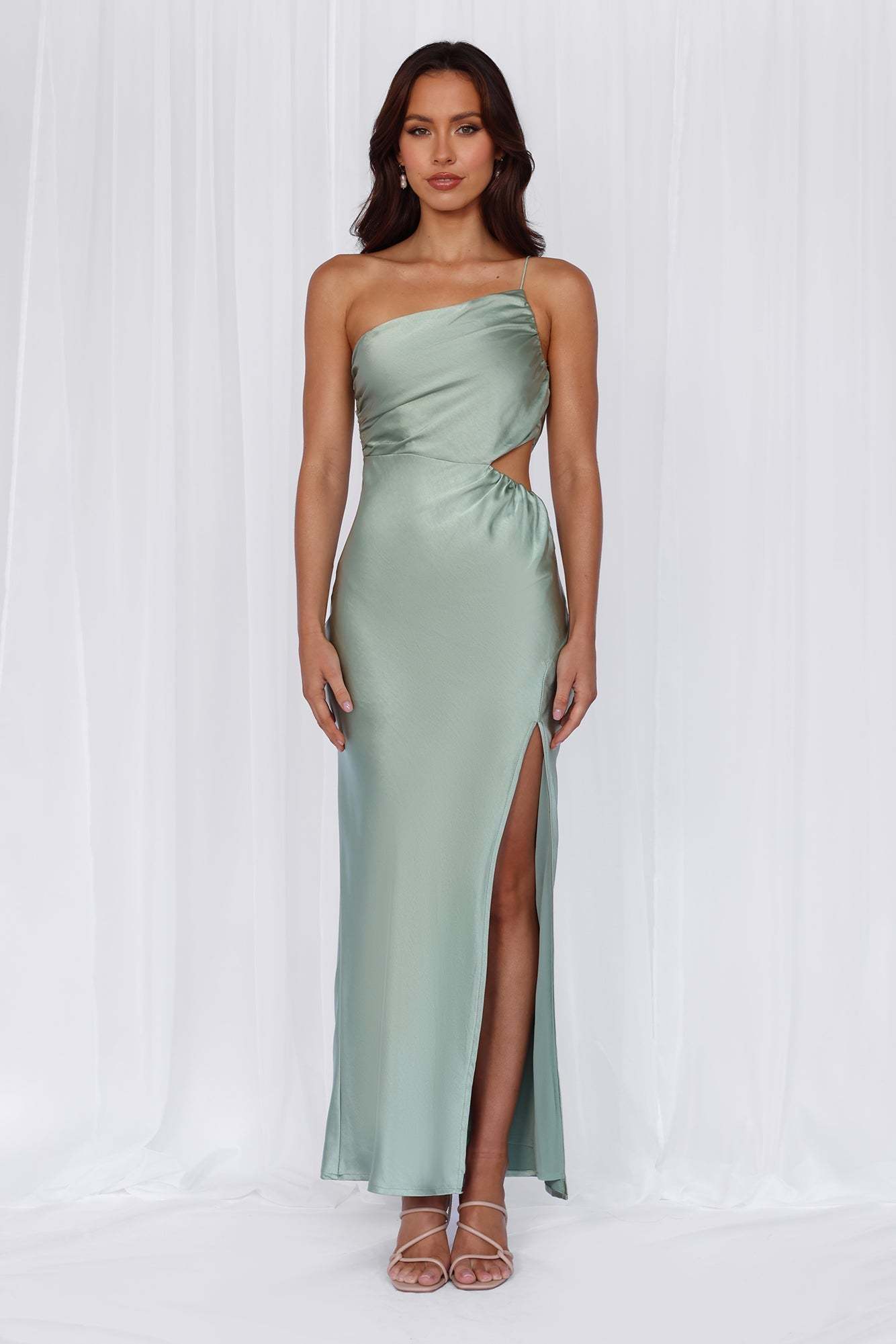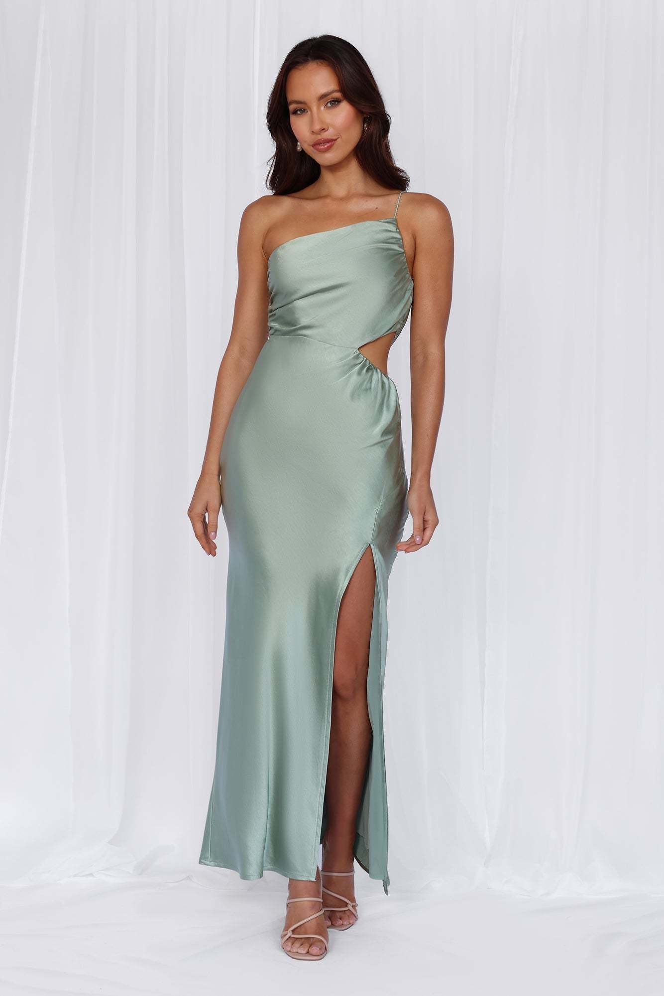 HELLO MOLLY The Opal One Shoulder Satin Maxi Dress Sage