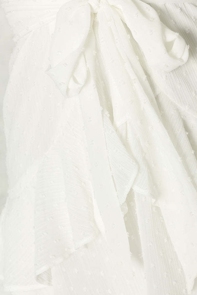Our Ice Cold Dress has a crossover V neckline. adjustable shoulder straps and it has an invisible back zip that's secured by a metal clasp. It also has a waterfall ruffle detail on the skirt. Wear yours with rose gold highlighter!