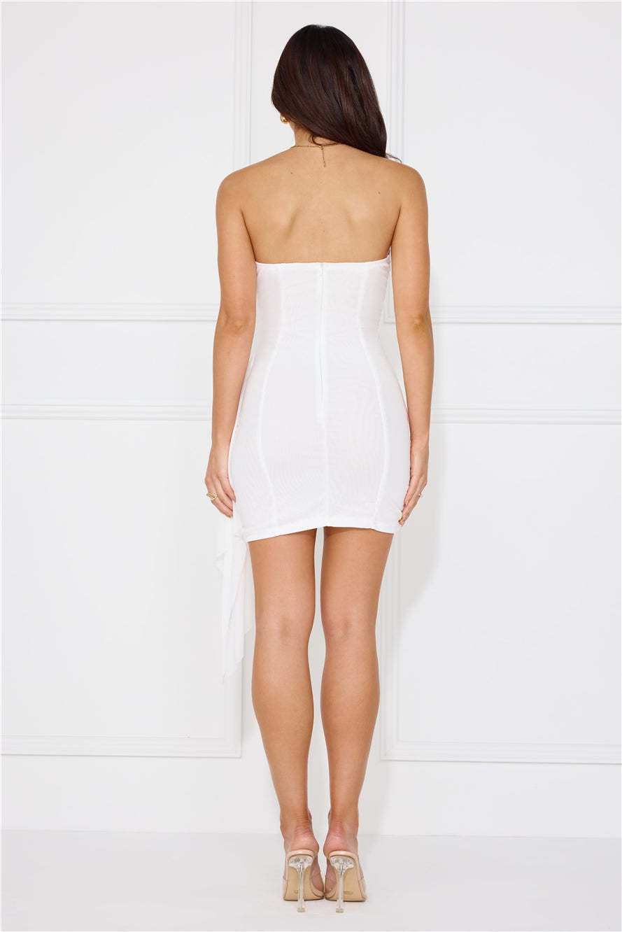 It's giving flirty. lovely. The Love Across Time Mesh Strapless Mini Dress features lace details to the neckline and hem. an asymmetric skirt and an inner grip. Style with heels to show off your romantic side.