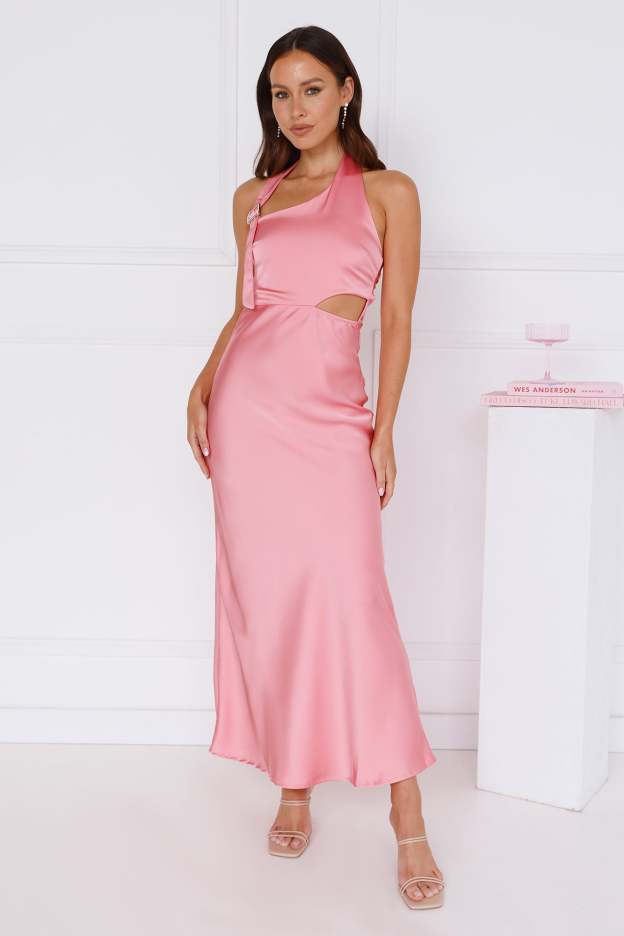 Be seen in the Love At Last Halter Satin Maxi Dress at your fancy event. Featuring a halter with a silver clasp closure. a waist cut out and an open back with a cowl design. Style with heels to feel fabulous.