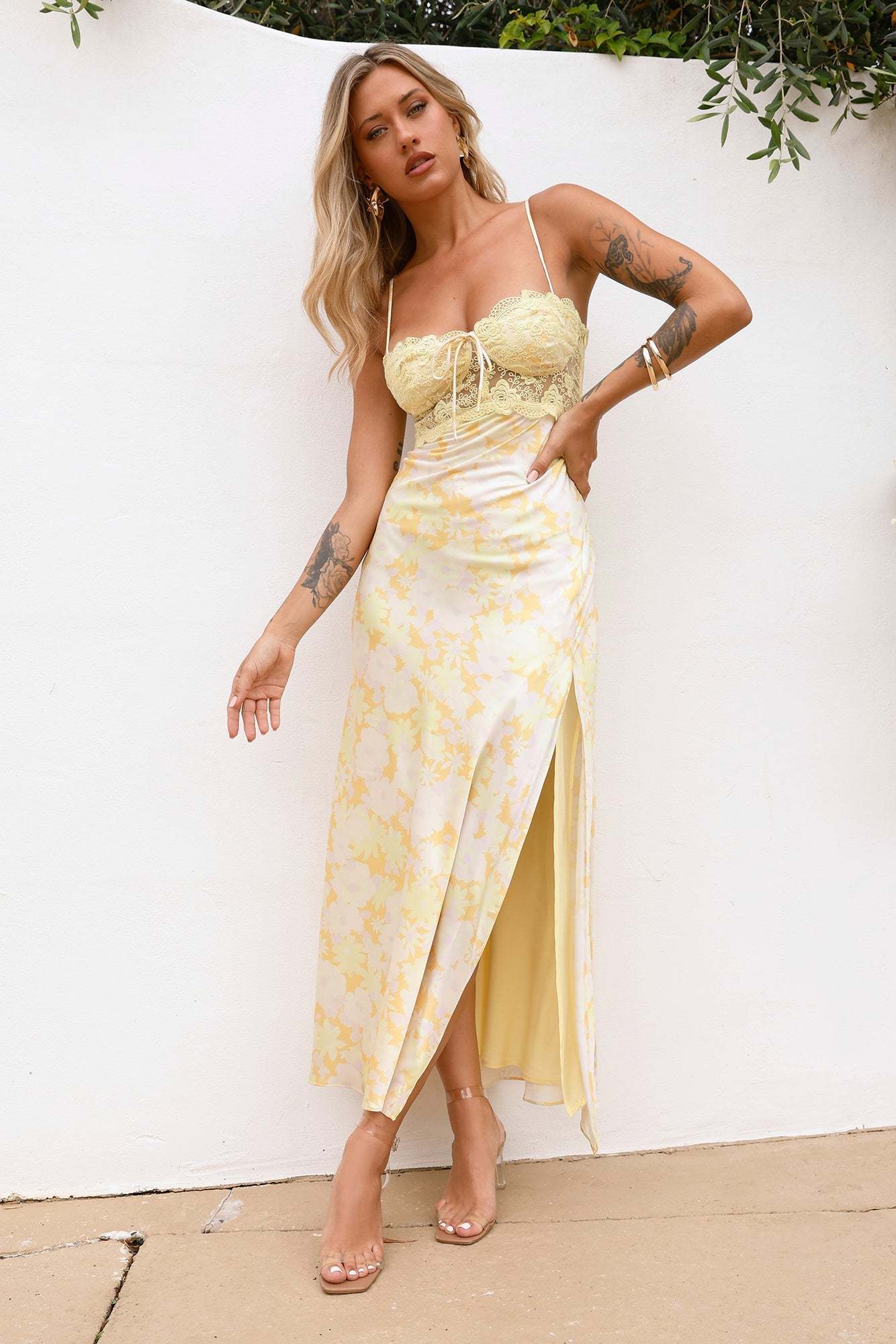 Lovely. it's time you gifted yourself! The Love From Me Satin Maxi Dress features a lace bodice and a straight. flowy skirt. We're in love with this dress paired with heels and curls.