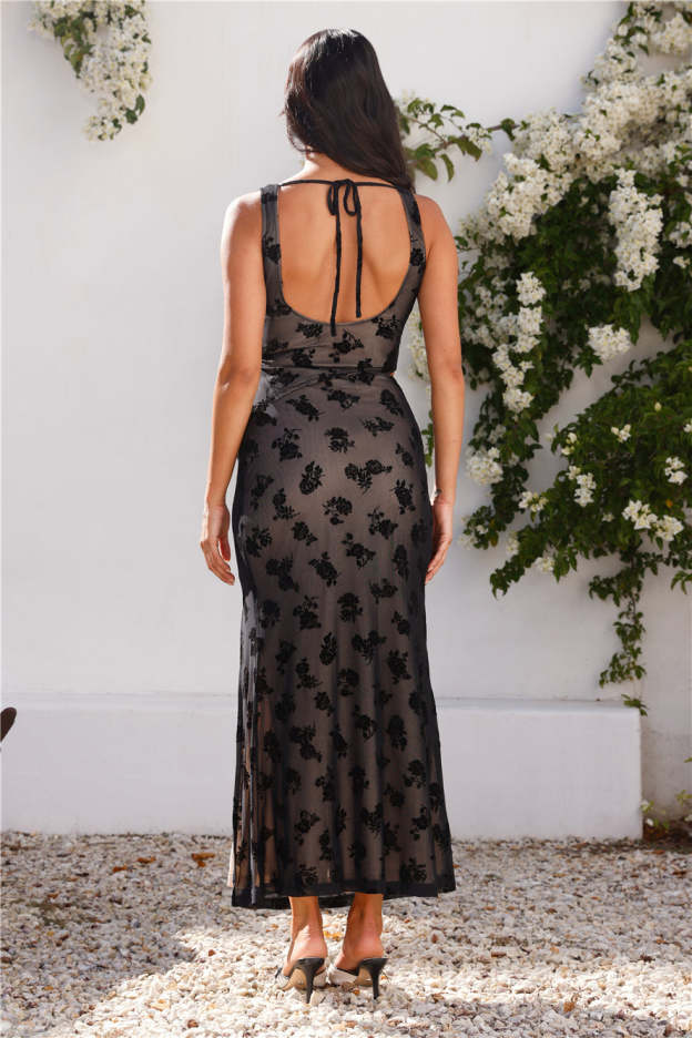 Lovely. the dreamiest skirt is here! The Midnight Rose Maxi Skirt features a mesh design with a floral pattern. a straight. flowy silhouette and a split. Style with the matching top for a 'fit we're in love with.