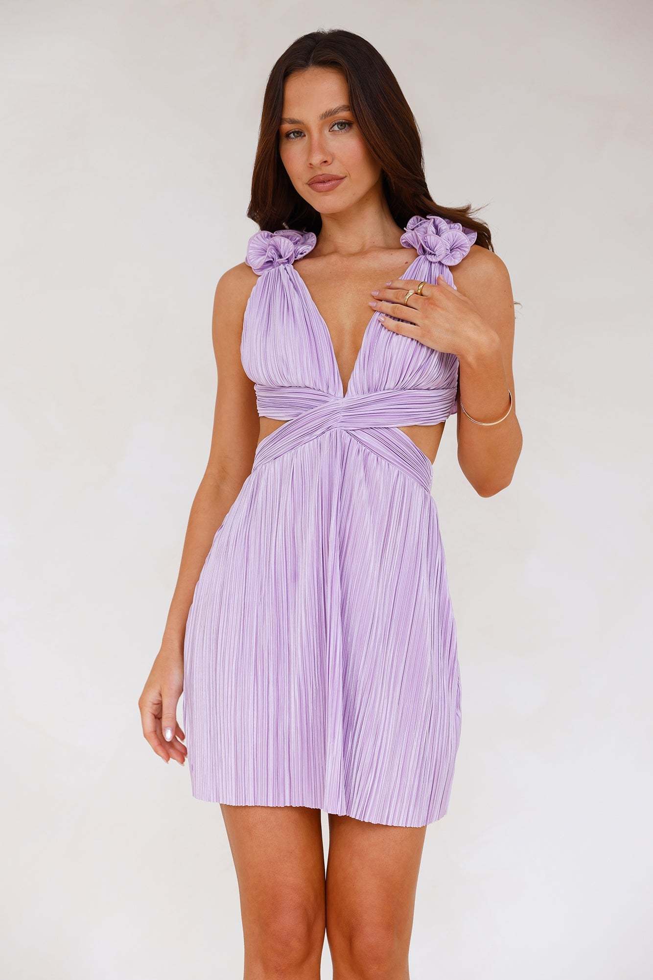 The 'fit of your dreams is here. The Moonlight Shimmer Mini Dress features a plisse satin fabrication. a cutout to the waist and a statement crisscross back. Style with heels and curls.