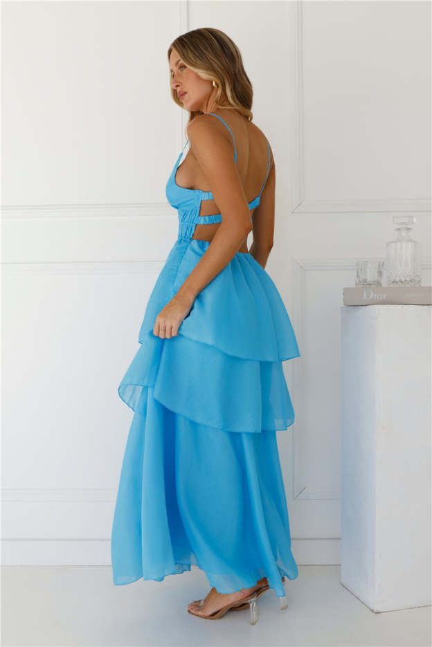 For a formal affair. be seen in no other than the One True Love Maxi Dress. Featuring a tiered frill skirt. an elastic back and a gorgeous hue. Style with heels and curls!