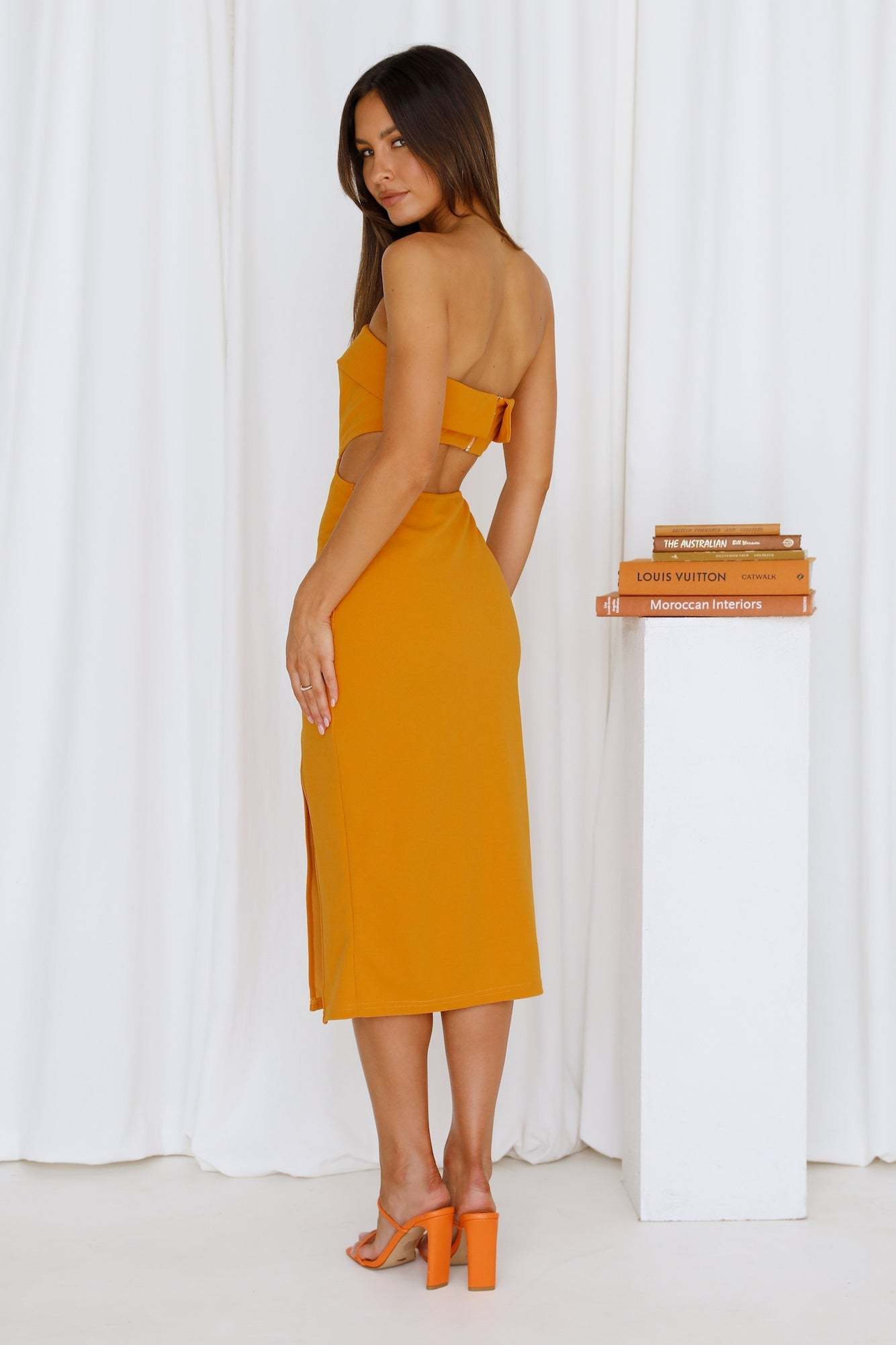 Only Strut when you're slaying in a midi this hot and iconic girl! Featuring a strapless design. with a foldover detail. waist cut-outs. an open back and a fitted skirt with a side slit. Style yours with heels and a bold lip.