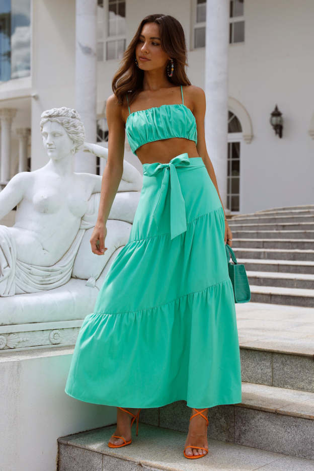 This is Our World. so make sure you're the main character. Try out this maxi; which has a subtle tier detail and a front tie. Style yours with the matching crop and mules.