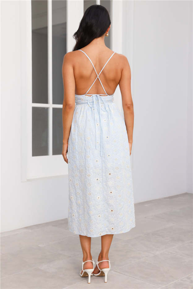 A dreamy style made for you. The Pastel Paradise Embroidered Midi Dress features a gorgeous open back with a crisscross tie. a flowy skirt and an embroidered detail with cream stitching. Style with sandals.