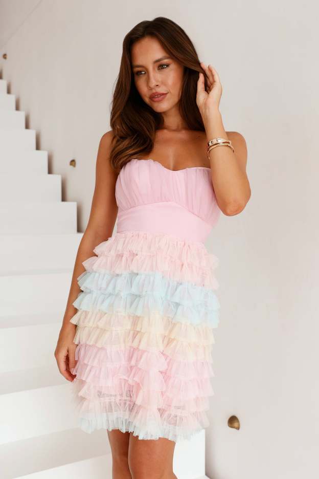 Enter a magical world in the Rainbow Dreams Tulle Mini Dress. Featuring a gorgeous tulle tiered frill skirt and a crisscross tie-up back. Style with heels for all the likes.