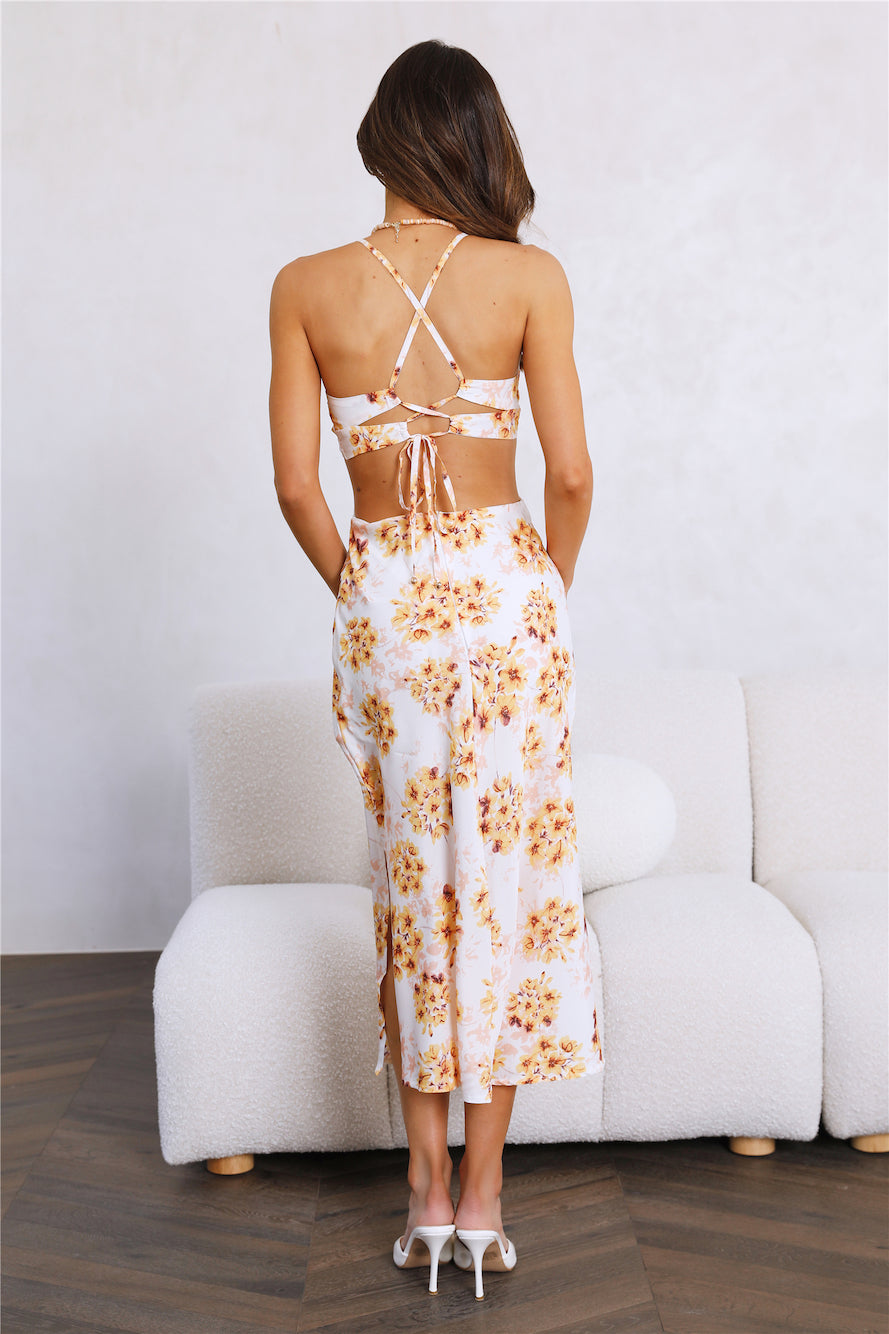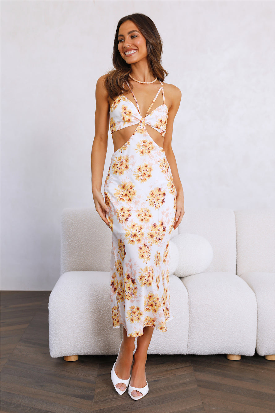 Show off this Renewed You in this stunning midi. Featuring a sweetheart neckline with a dramatic midriff cut-out. statement cut-outs at the back and side slits. Style yours with mules and waves.