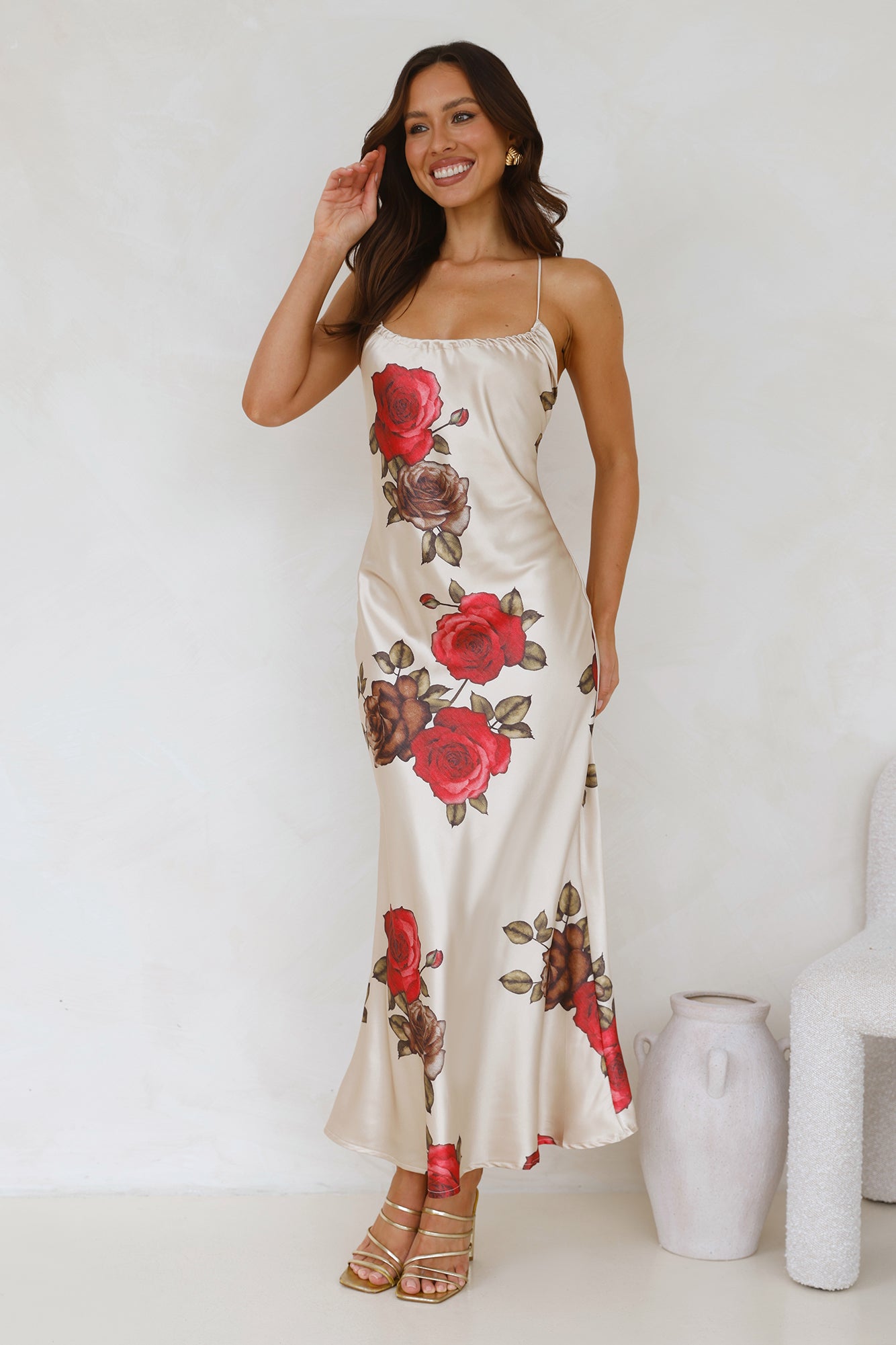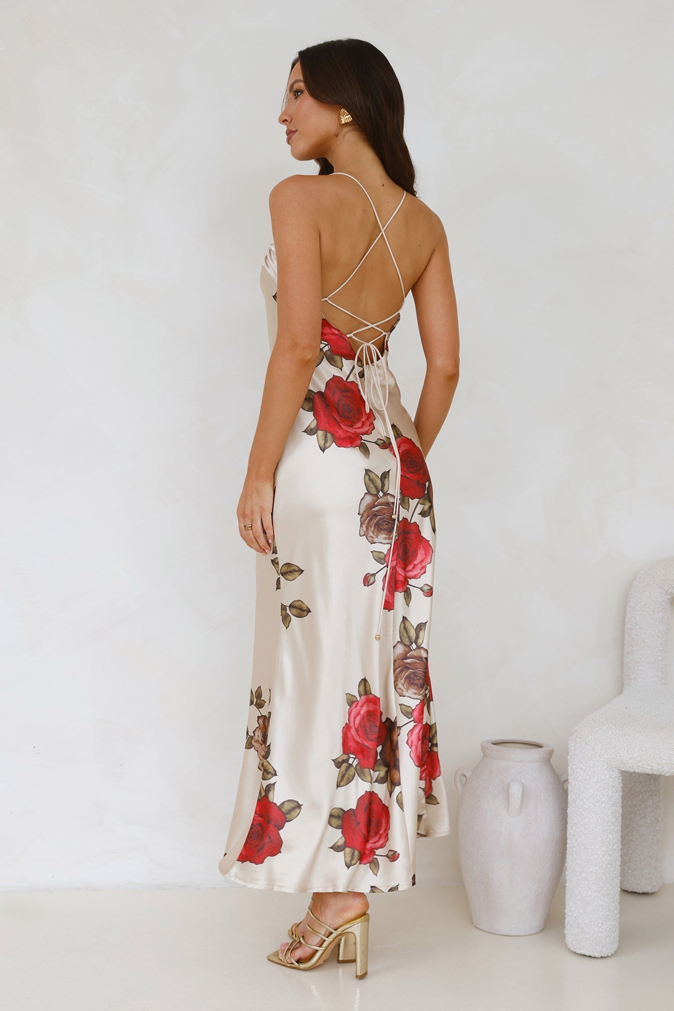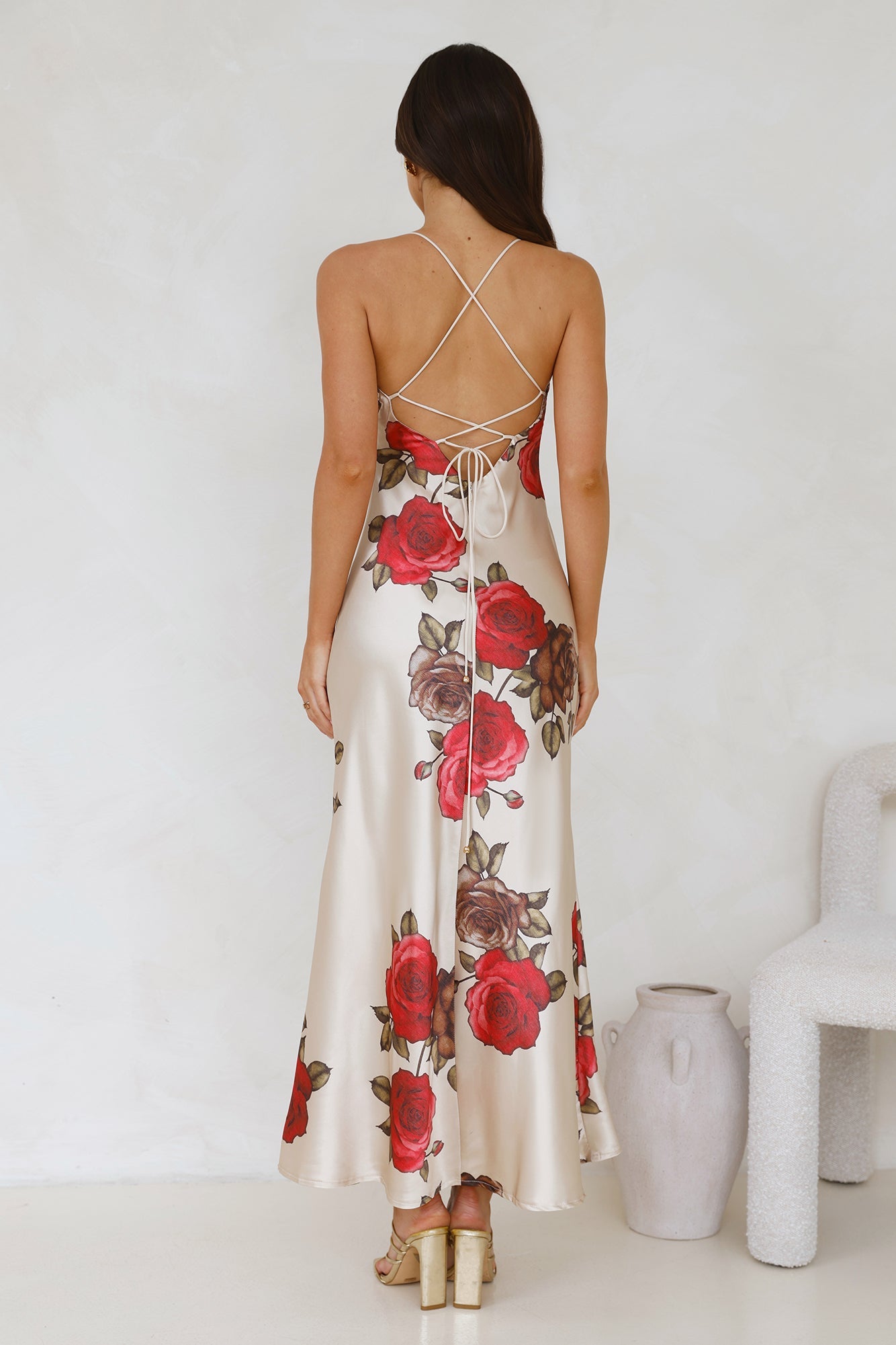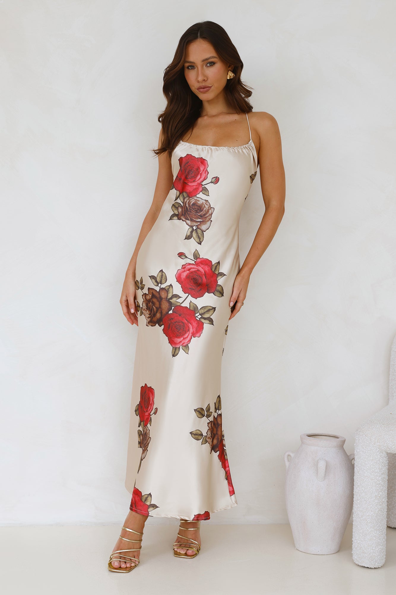 Designed for special occasions. The Rose Between Thorns Satin Maxi Dress features a silky silhouette. a crisscross tie-up back and a gorgeous print. Style with heels and curls.