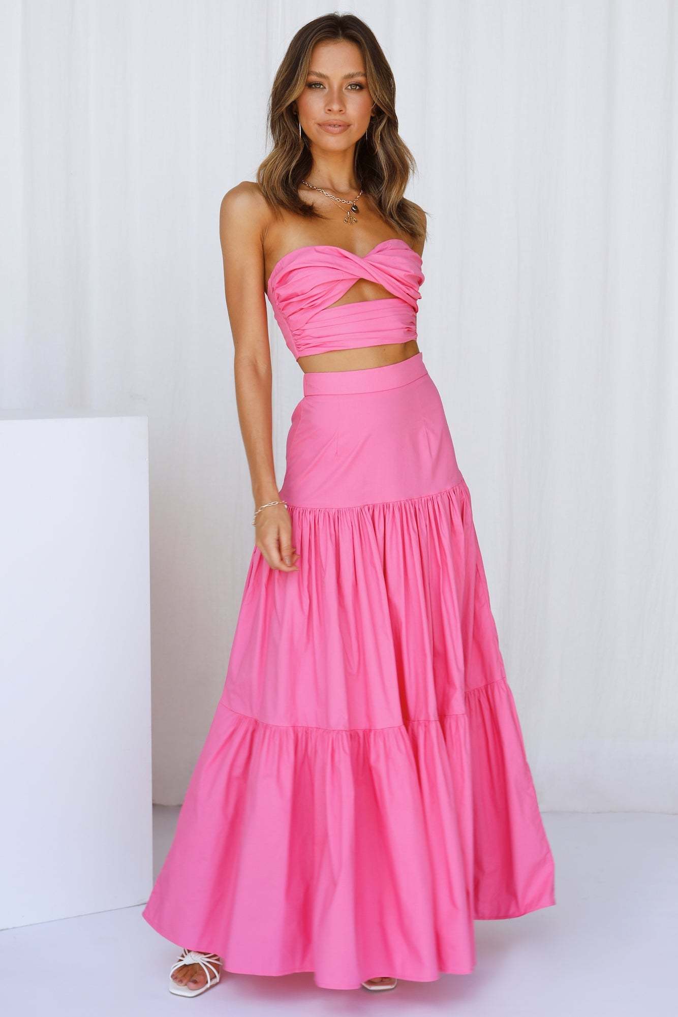 Enter the season of events in the most stunning maxi skirt. With a maxi length. tired detail and gorgeous tight high waist fit. this skirt was made for you! Complete the look with the matching crop and some white dainty heels.