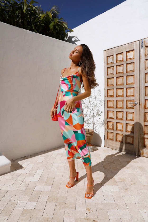 Make sure to rock the world with these looks you got going! The Mariposa Midi Slip is the PERF way to strut the streets this weekend. Featuring a cowl neckline. an open back with a lace-up detail and a long flowy slip design. Style yours with mules and gold accessories.