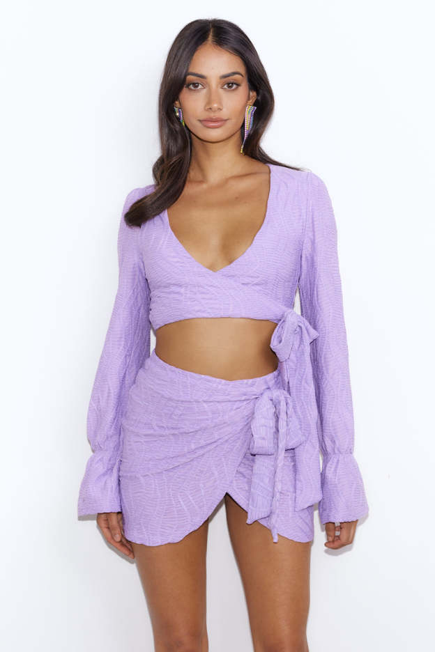 You'll want to wear this top to every event. girl. The Seen First Crop Top features long sleeves and a wrap tie-up design. Style with the matching skirt and heels for all the likes.