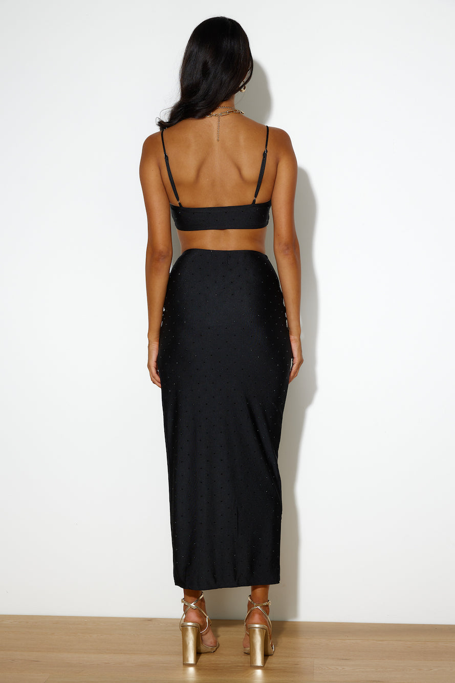 Own the attention you're going to get in the She's Got The Charm Midi Skirt. Featuring diamante detail and a stretchy fit. Style with the matching top and heels.