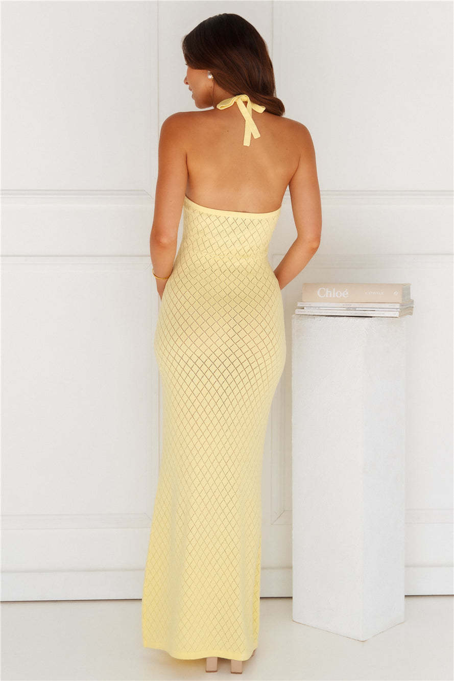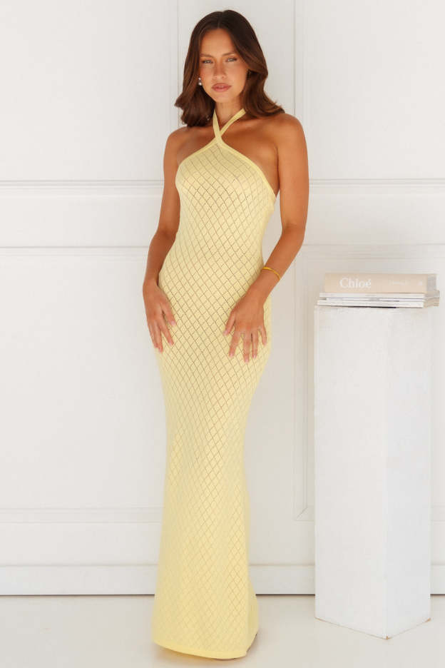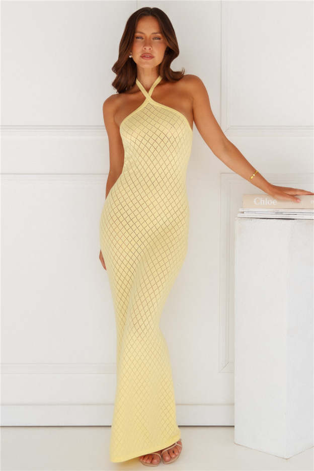 Your beach club essential. The Simi Maxi Dress by RUNAWAY features a luxe knit design. a halter tie and a slip on style. Pair it with slides and accessories.