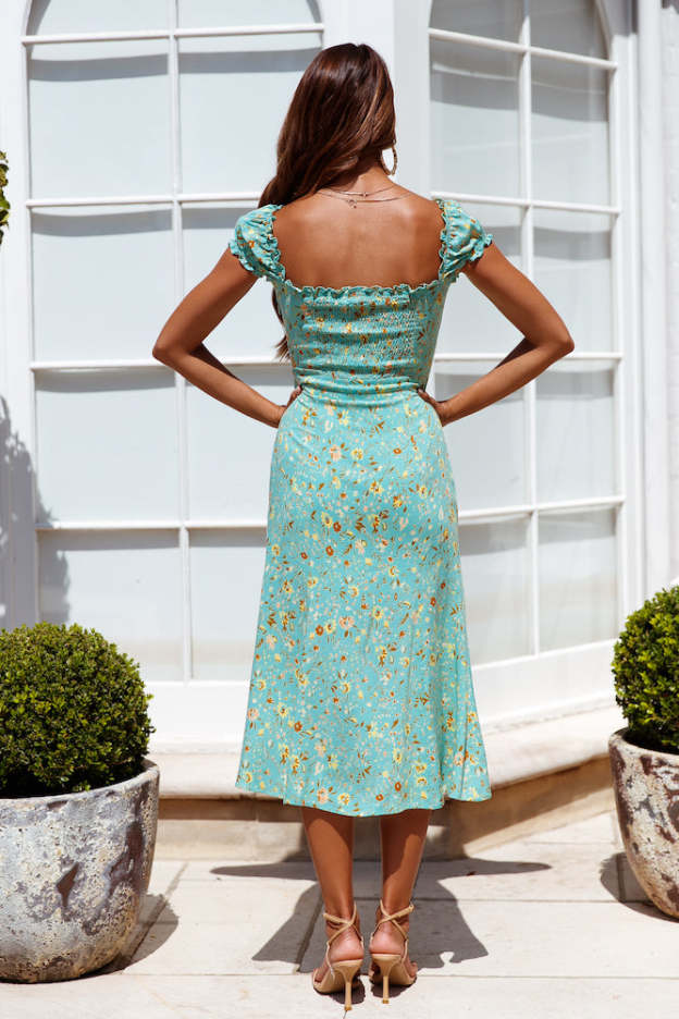 Too set in your non-dairy milk alternative ways? See how we can persuade you with our favourite style. the Single Status Midi Dress. This sugary sweet midi dress features our feminine milkmaid bust that's exemplified by frilled edging. peasant puff sleeves and a lush falling floral print throughout. We admit we're a little bit obsessed with the dress's flirty thigh vent!