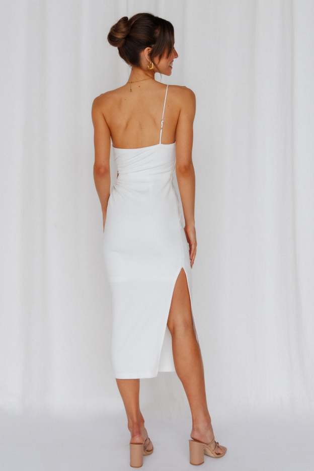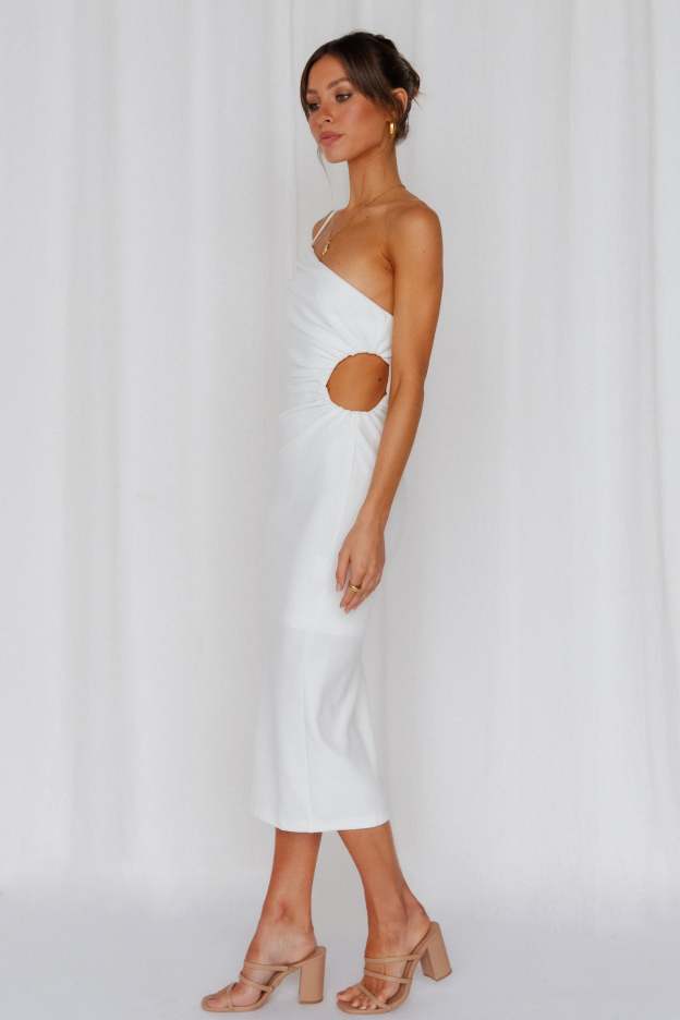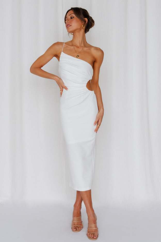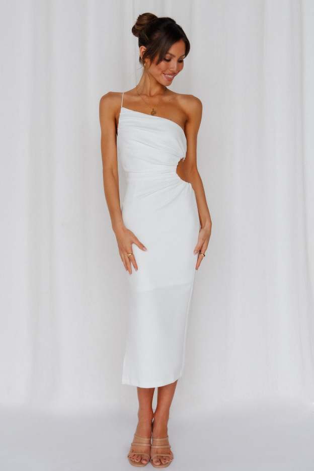 You're going to cause the app to crash with all the right swipes you'll be getting in this midi. The Smooth Lines Dress has an asymmetrical neckline with one shoulder strap. cut-outs and a side slit. Stunning! Style yours with strappy heels and gold adornments.