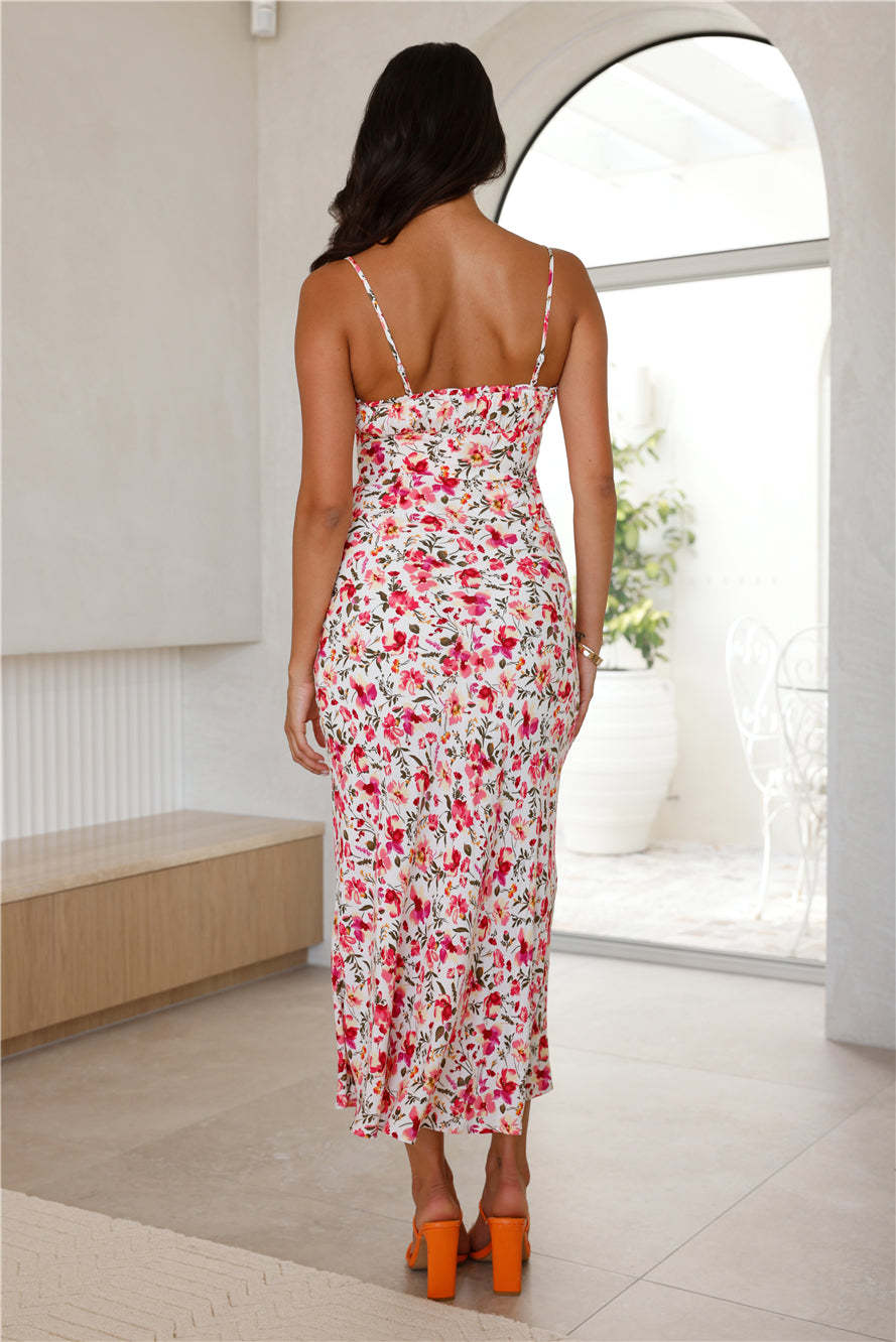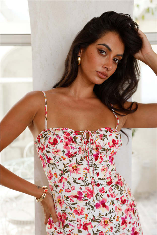 Embrace your love for pretty prints with the Sprinkle Petals Midi Dress. Featuring a front tie and adjustable shoulder straps. Style with sandals for a summer picnic.
