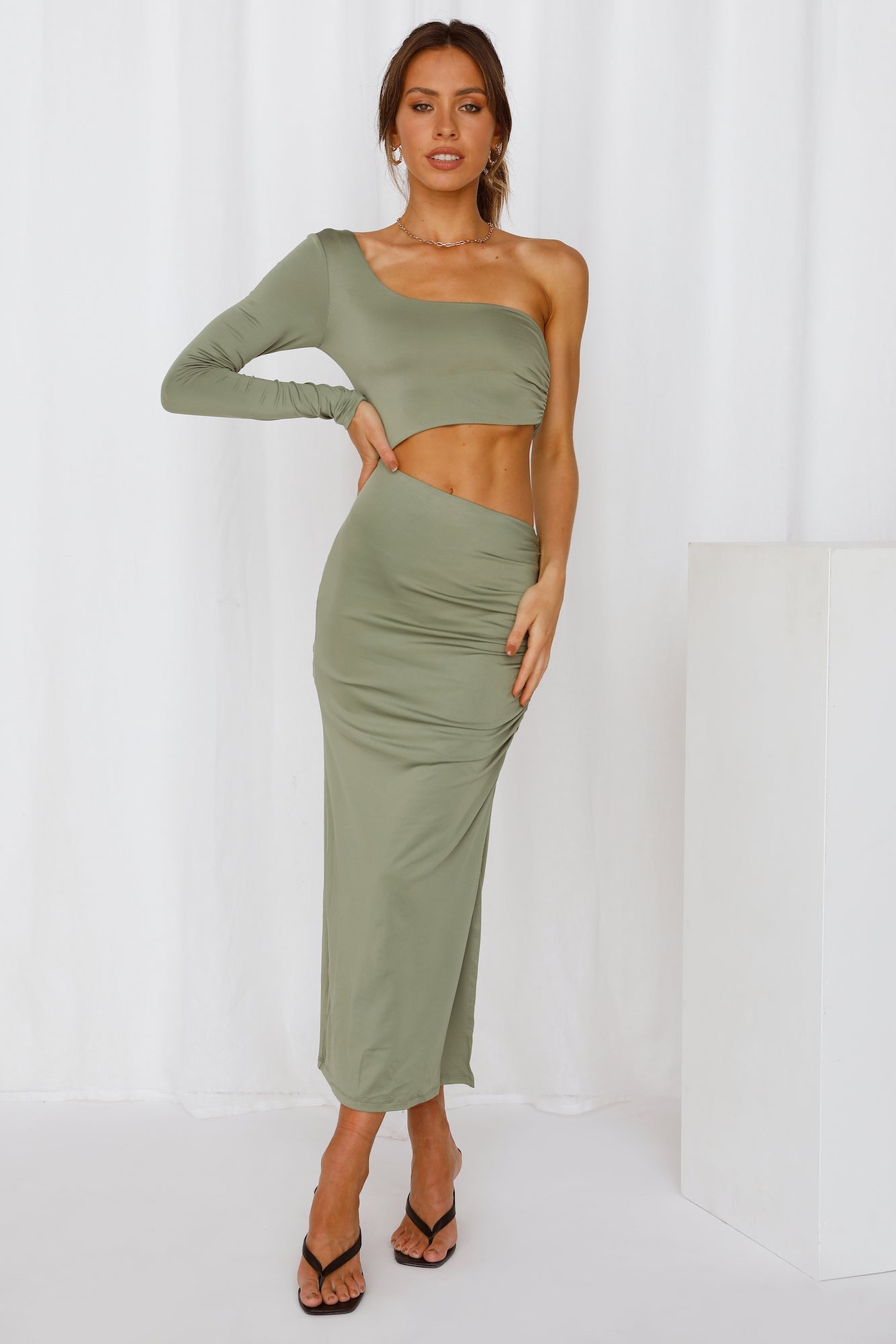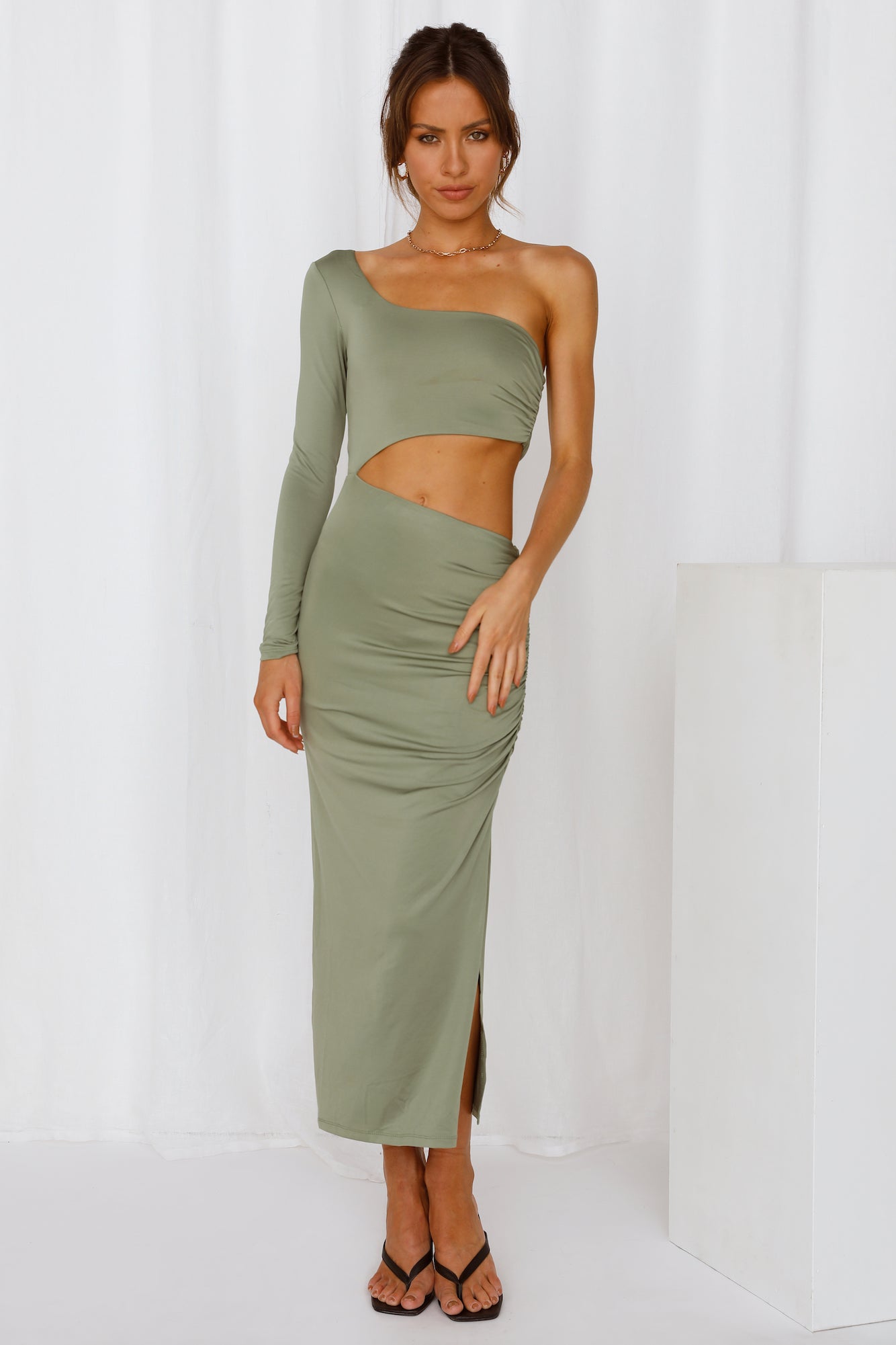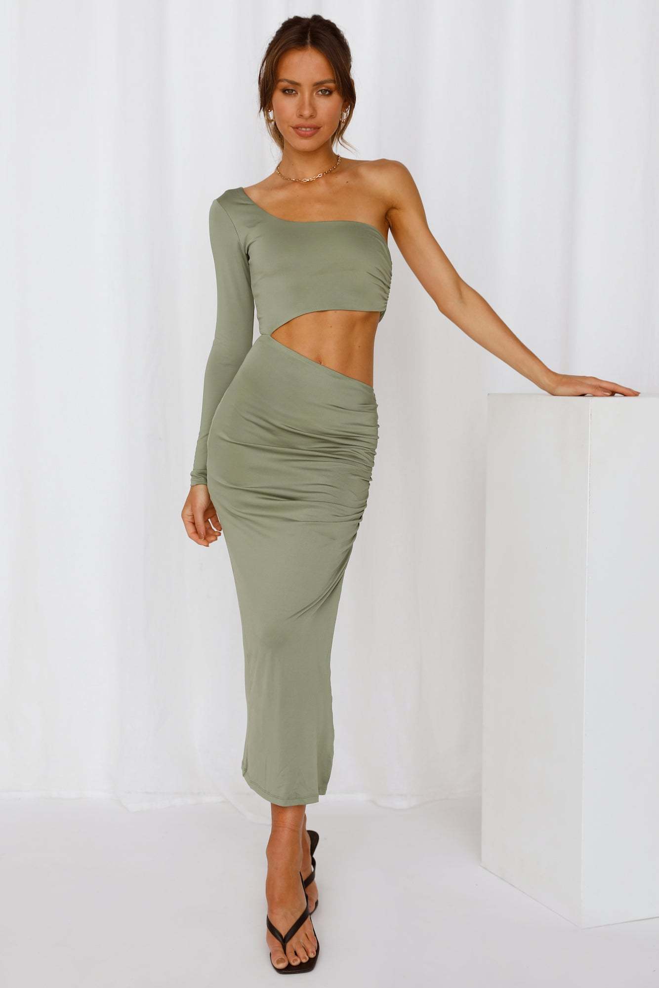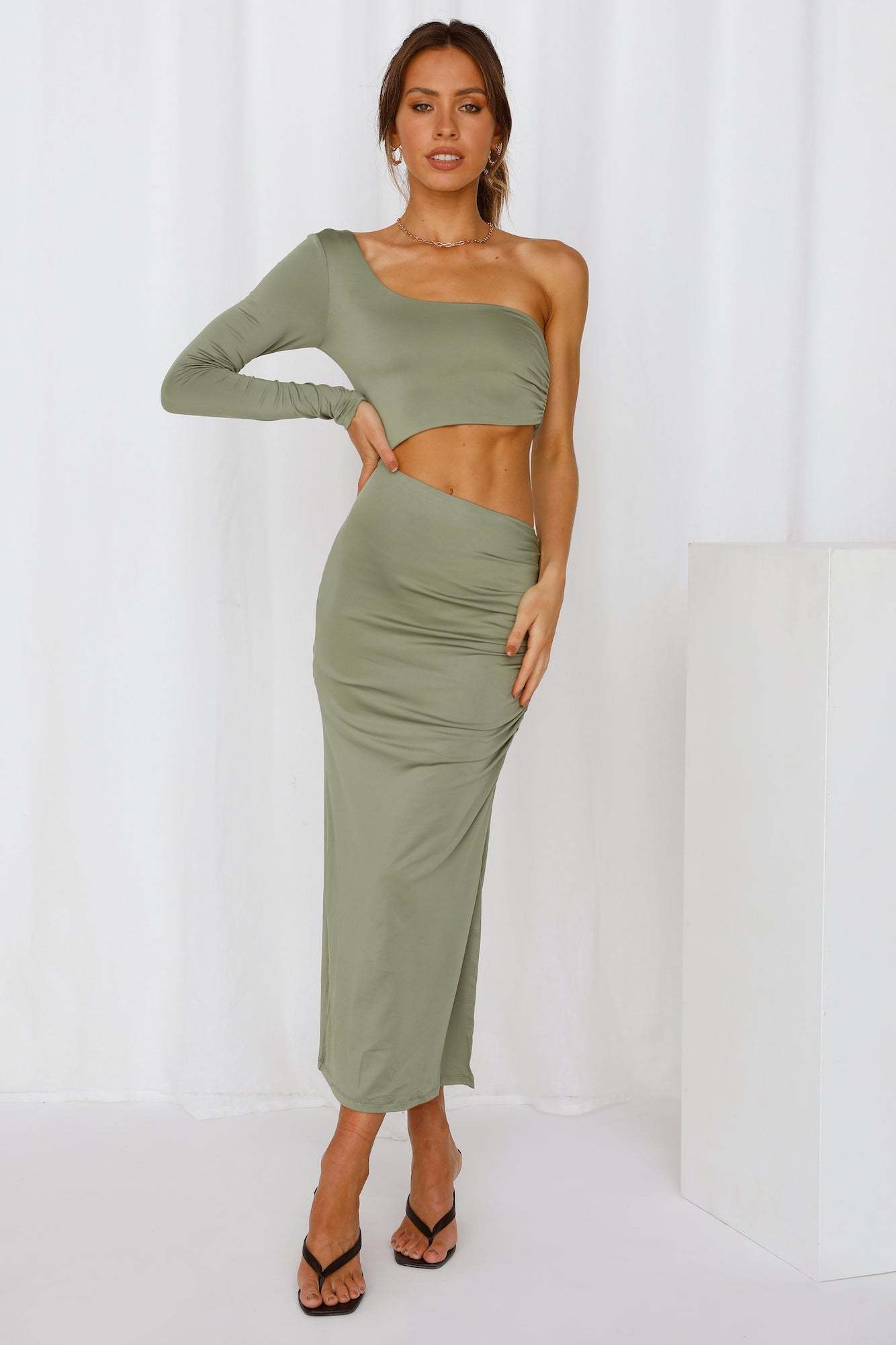 OMG do you see that girl? The hottest one here?? Oh wait. that's a mirror. We always knew you were the cutest one around. so try out the Suave Kiss Midi and heighten your beauty! This piece features a slashed necklince. with one long sleeve. a dramatic midriff cutout. slight ruching and a side silt. Style yours with strappy heels and waves.