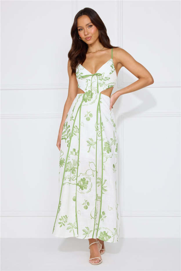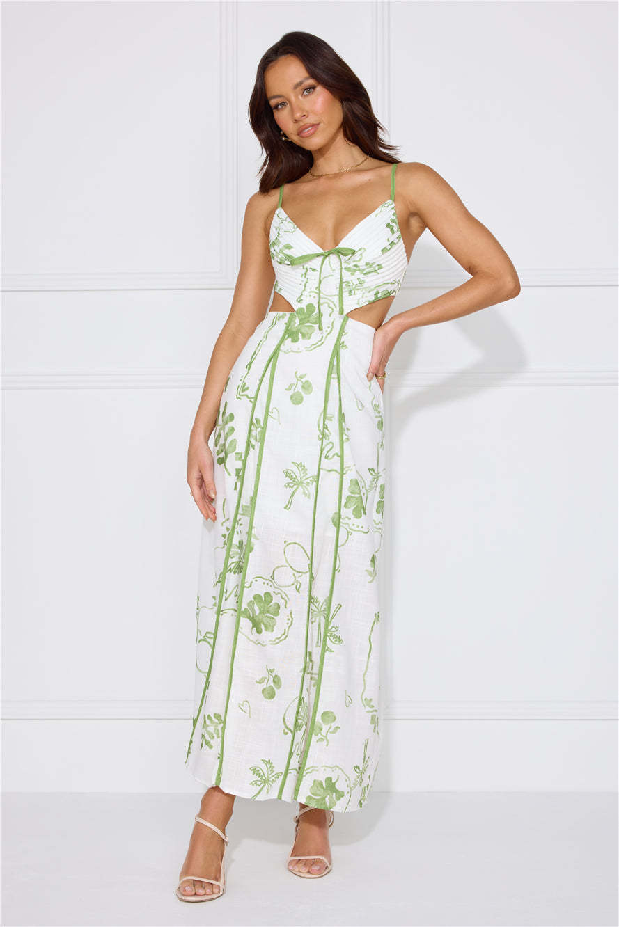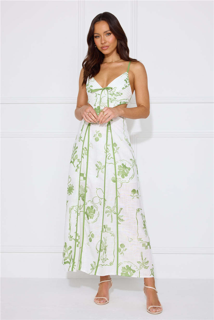 Soak up the sunshine in the Summer Garden Maxi Dress. Featuring a dreamy pattern. a pleated top and a cutout to the waist. Style with sandals and curls for a 'fit we are in love with.