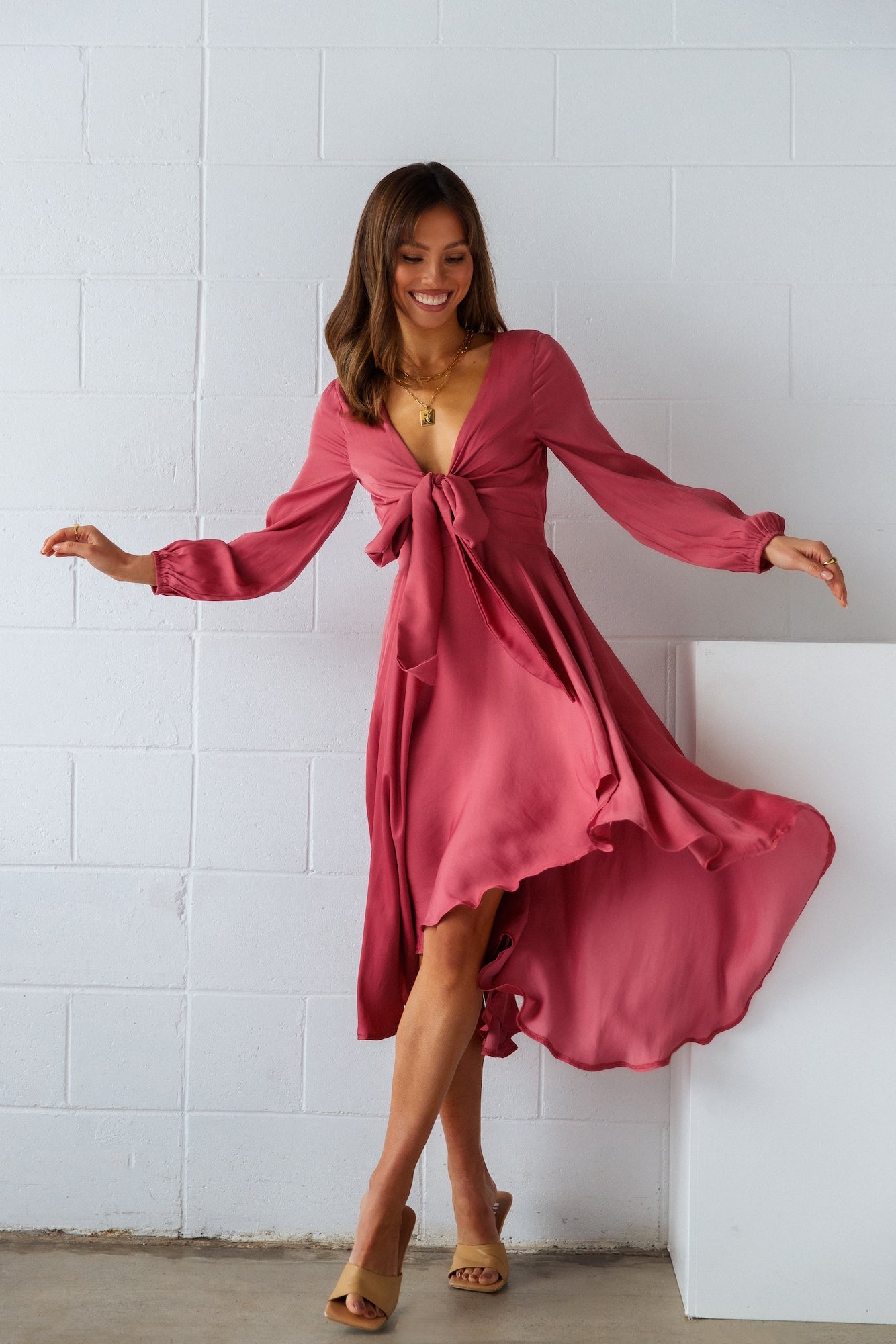 Our Talk Fast Midi Dress features a tie-up front detail. this style also has full-length sleeves with elastic at the cuff! There Is a button at the neck and an invisible zipper running through the back. Style yours with high heels + gold earrings.