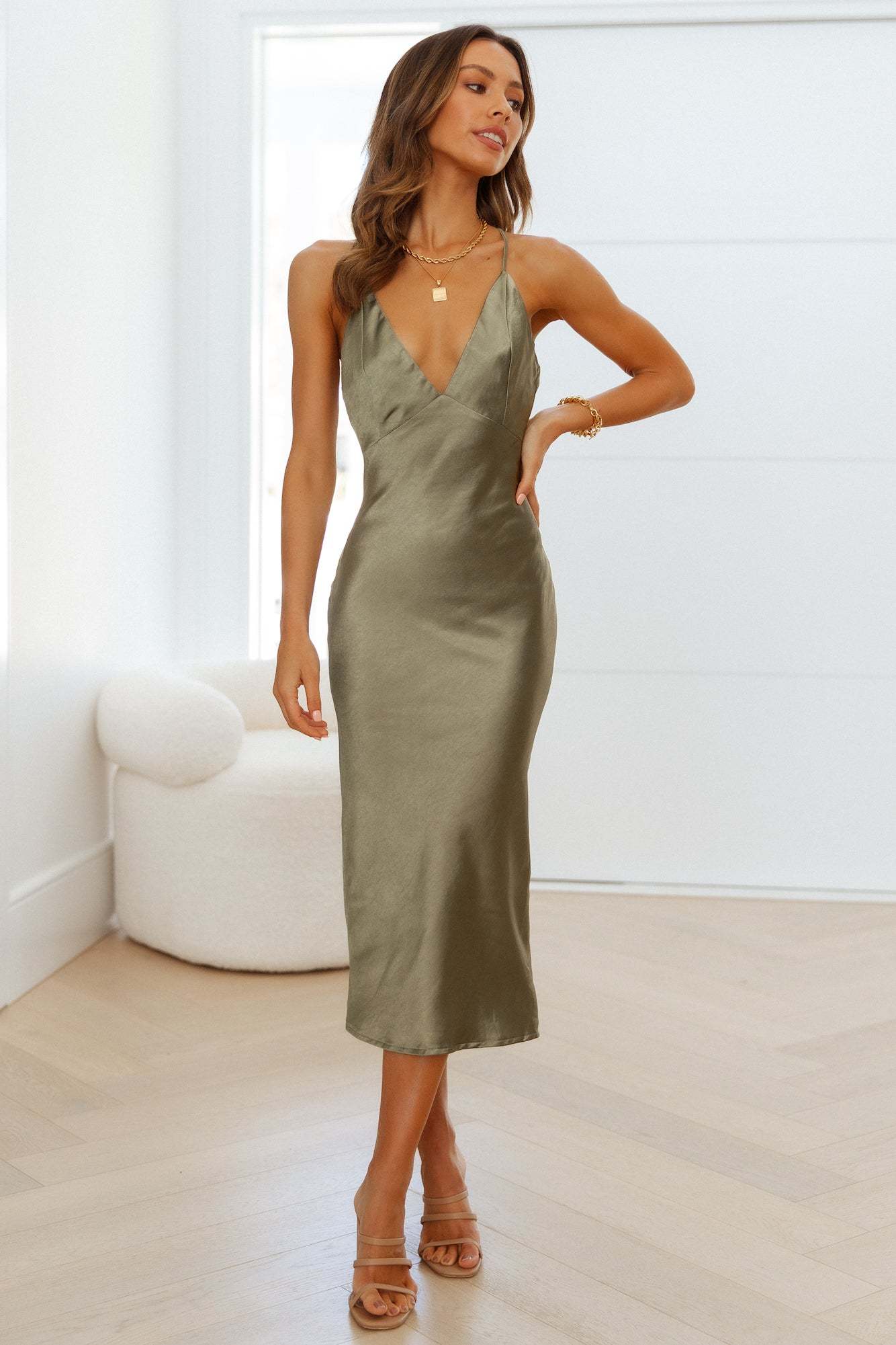 Stop right there girl. silky midi dresses are the biggest trend. The Text Me Later Dress has you in awe with its stunning v-neck cut. and dainty shoulder strap which crisscrosses at the back and creates a t-bar detail. Slide in the weekend in this fit with black croc mules and a stylish hair-do.