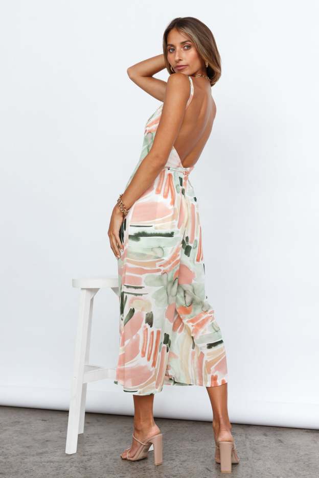 - Pink. green print jumpsuit.