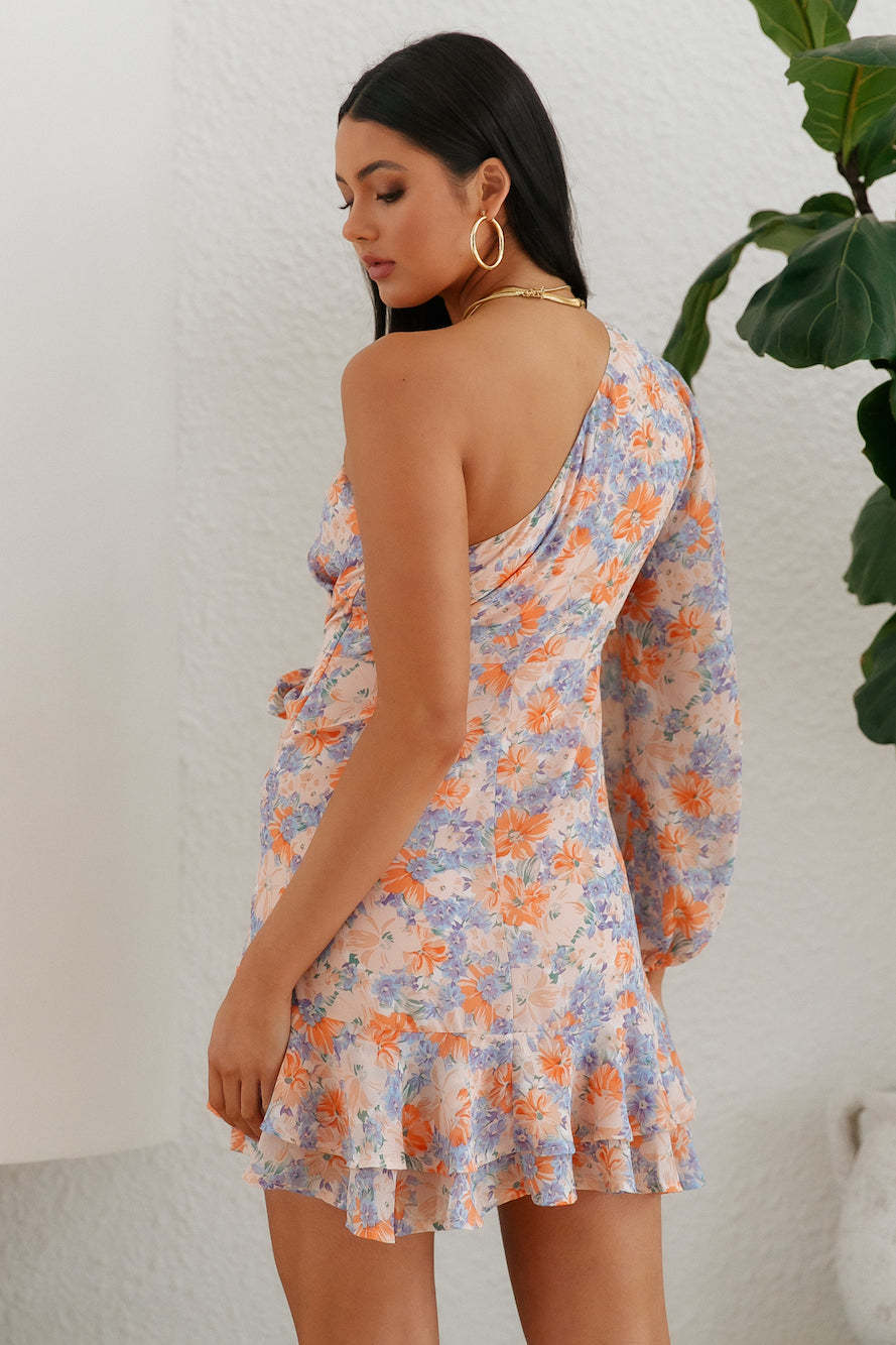 Live The Sweet Life in this GORG mini. Featuring a slashed neckline. one long sleeve. a side tie and ruching. Style yours with mules and waves.