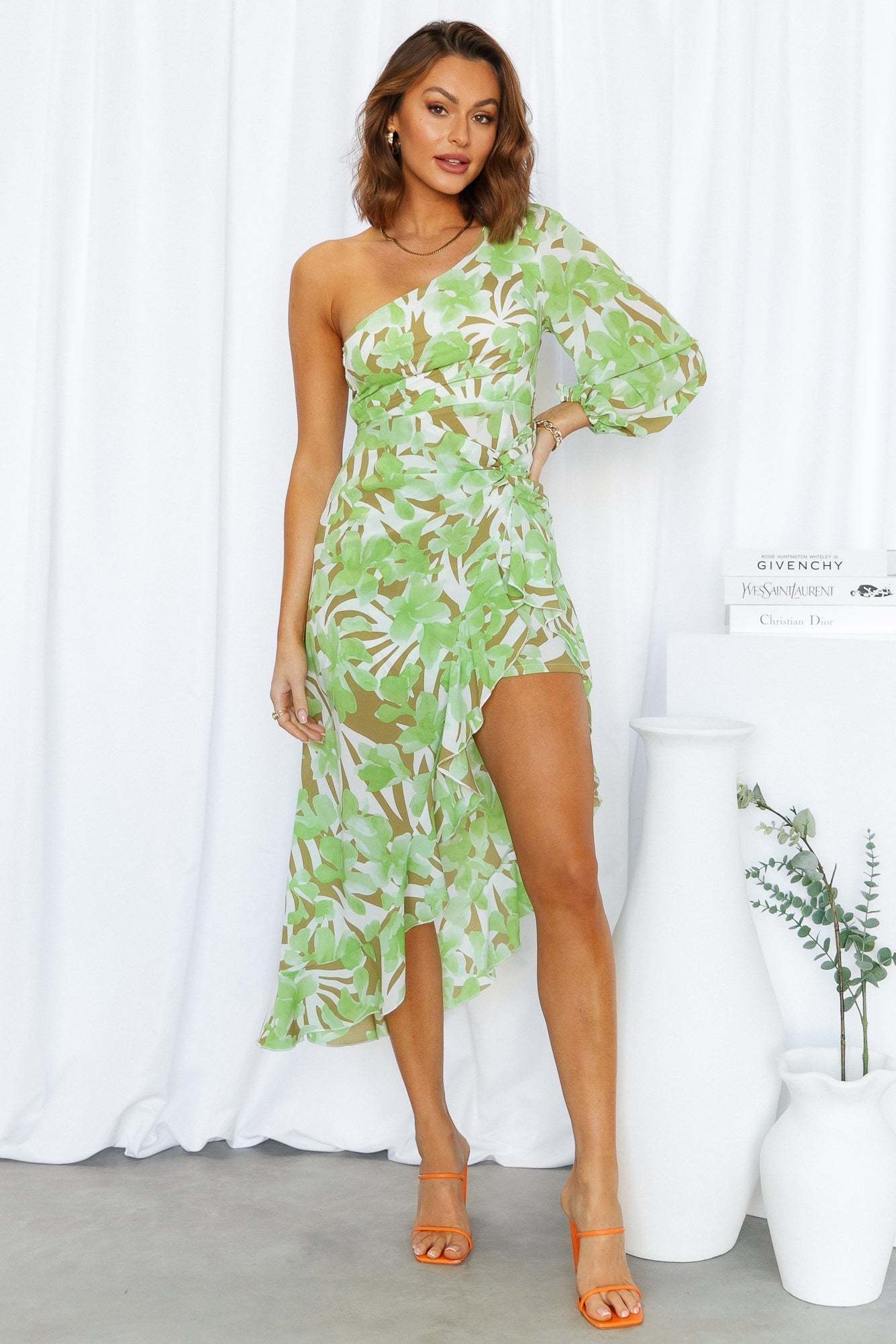 Introducing the newest addition to your wardrobe: the Tropic Air Midi. This fun yet sophisticated dress is perfect for any event. whether you're going for brunch or going out for drinks with the girls. Featuring a FAB print. a slashed neckline. one long sleeve. a wist-tie and an asymmetrical hemline. Style yours with heels and waves.