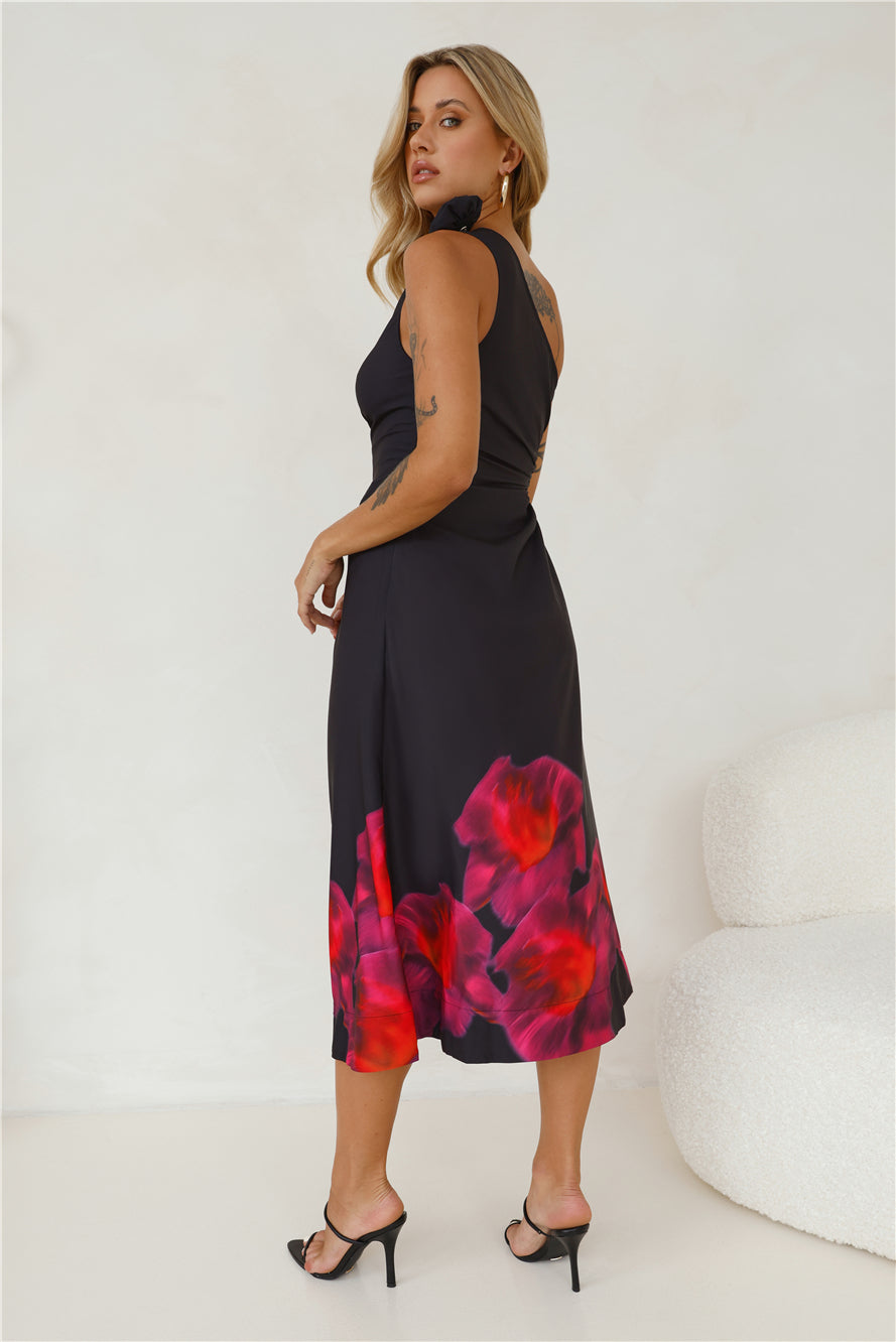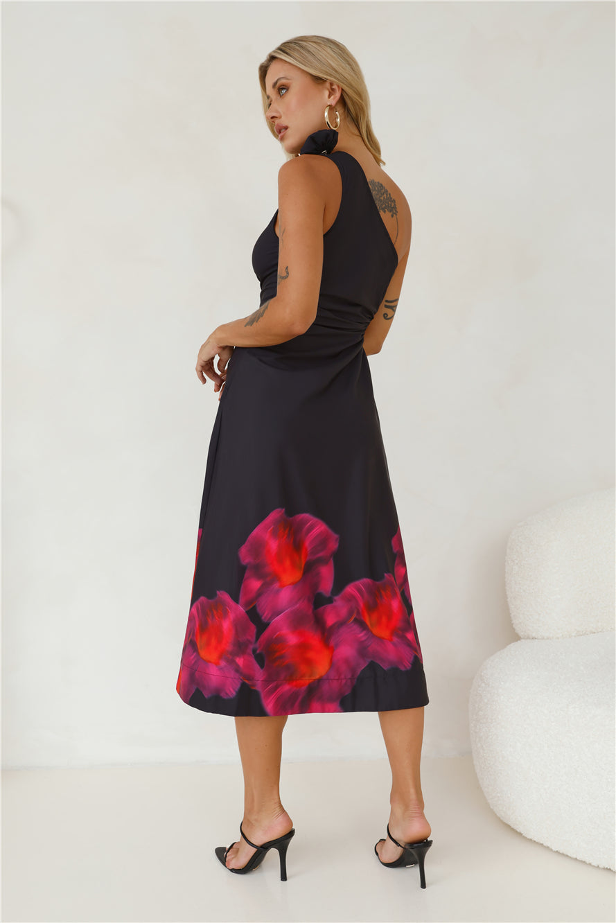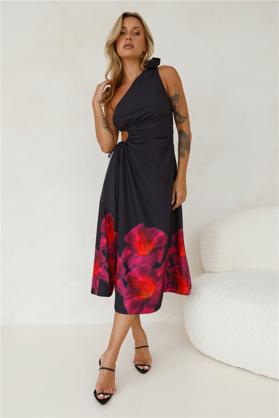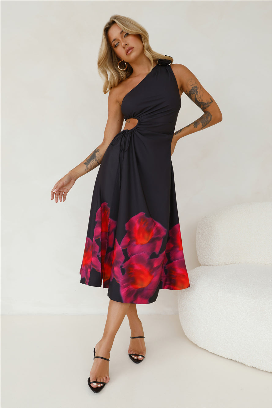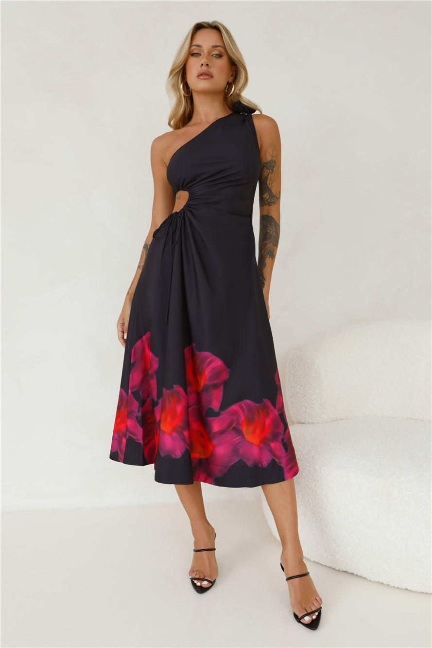 Feel as gorgeous as you look. girl. The Ultimate Party One Shoulder Midi Dress features a tie-up drawstring cutout to the waist and a flower brooch that can be removed and placed anywhere on the dress. Style with heels and curls for all the likes.
