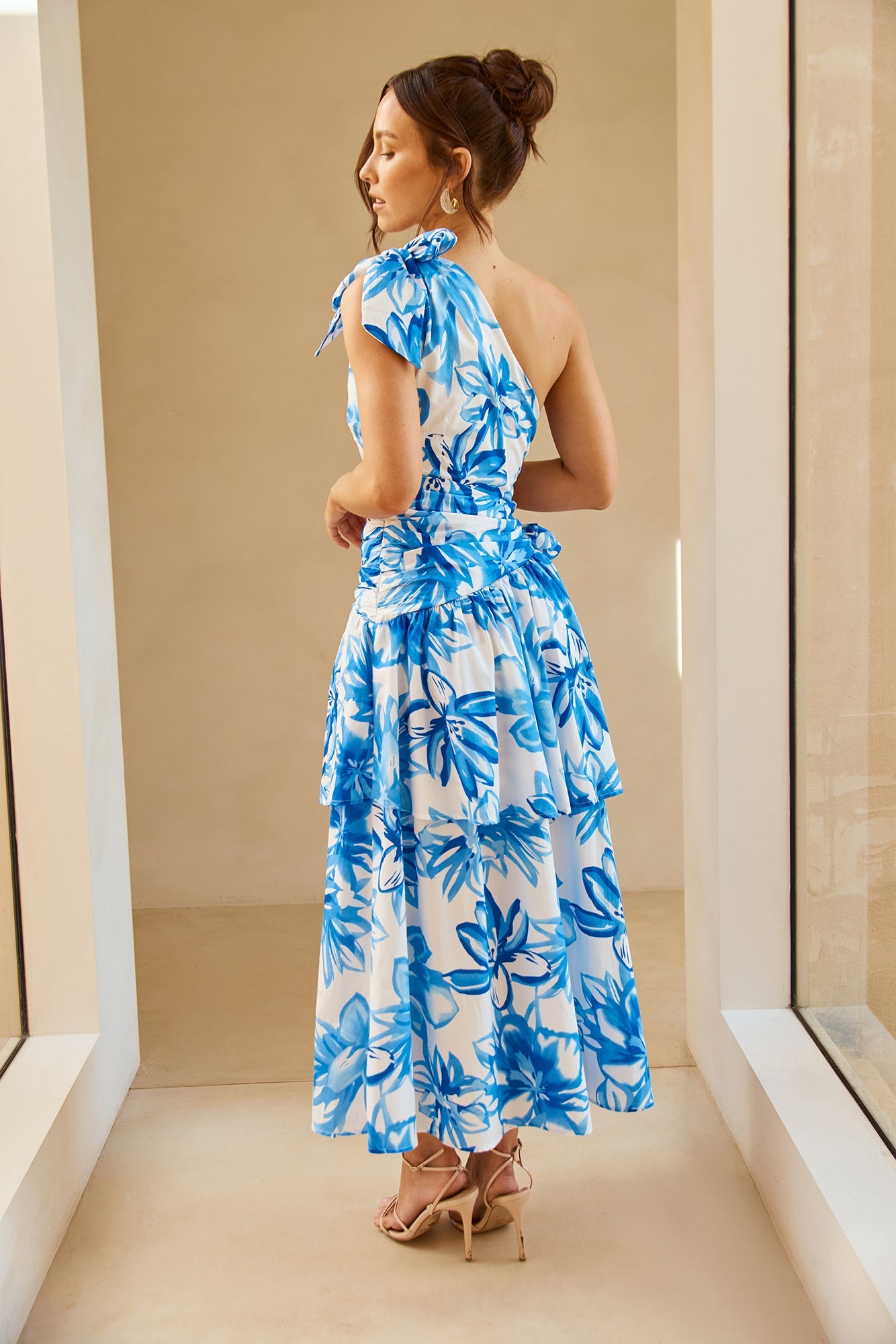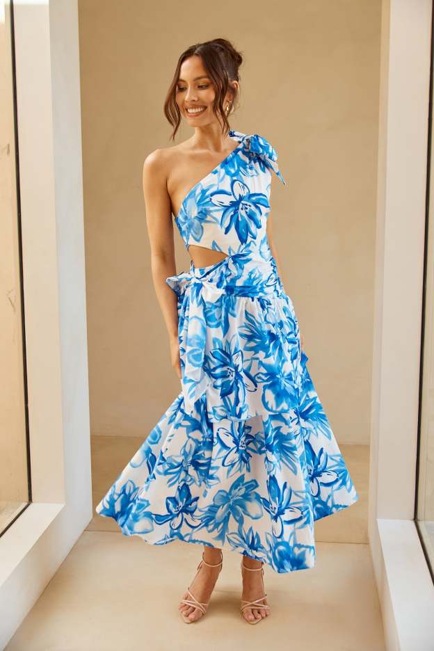 Channel your inner style with the Vibrance Lover One Shoulder Midi Dress. Featuring a cutout to the waist with a tie detail. a flowy skirt and a summery print. Style with heels to get the attention started.