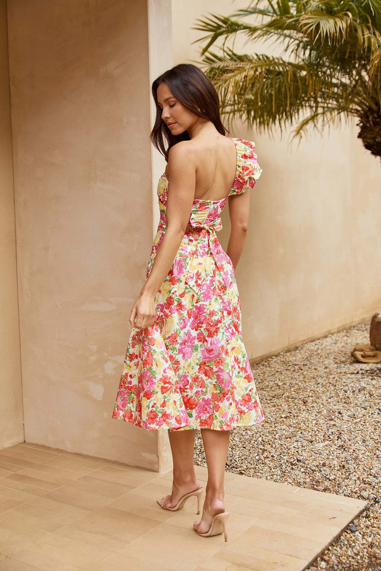 Manifest a flirty summer romance in the Vibrant Rendezvous One Shoulder Midi Dress by HELLO MOLLY. Featuring a gorgeous one-shoulder design with a frill. a tie-up top and a flowy skirt. Style with sandals for a 'fit to be seen in.