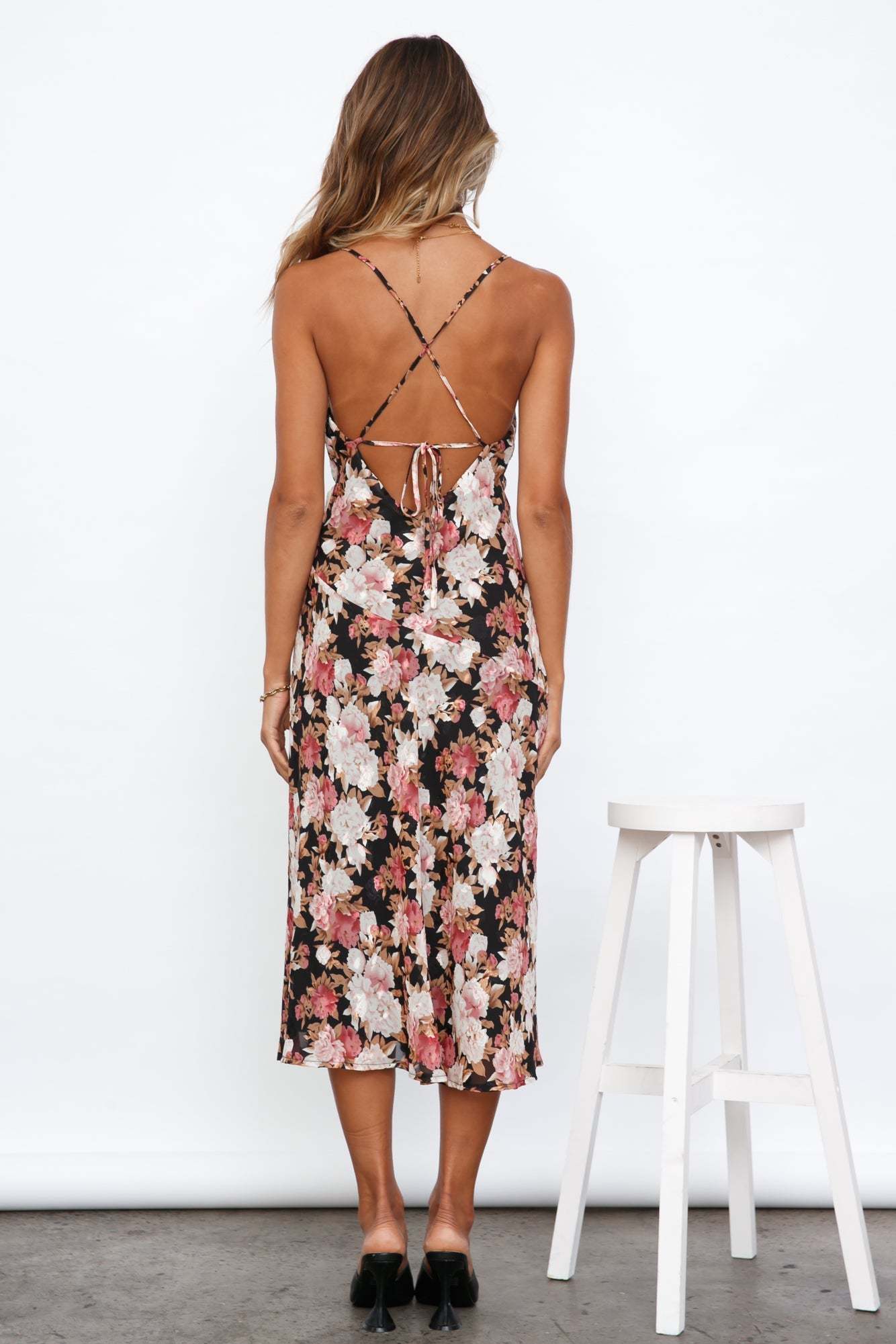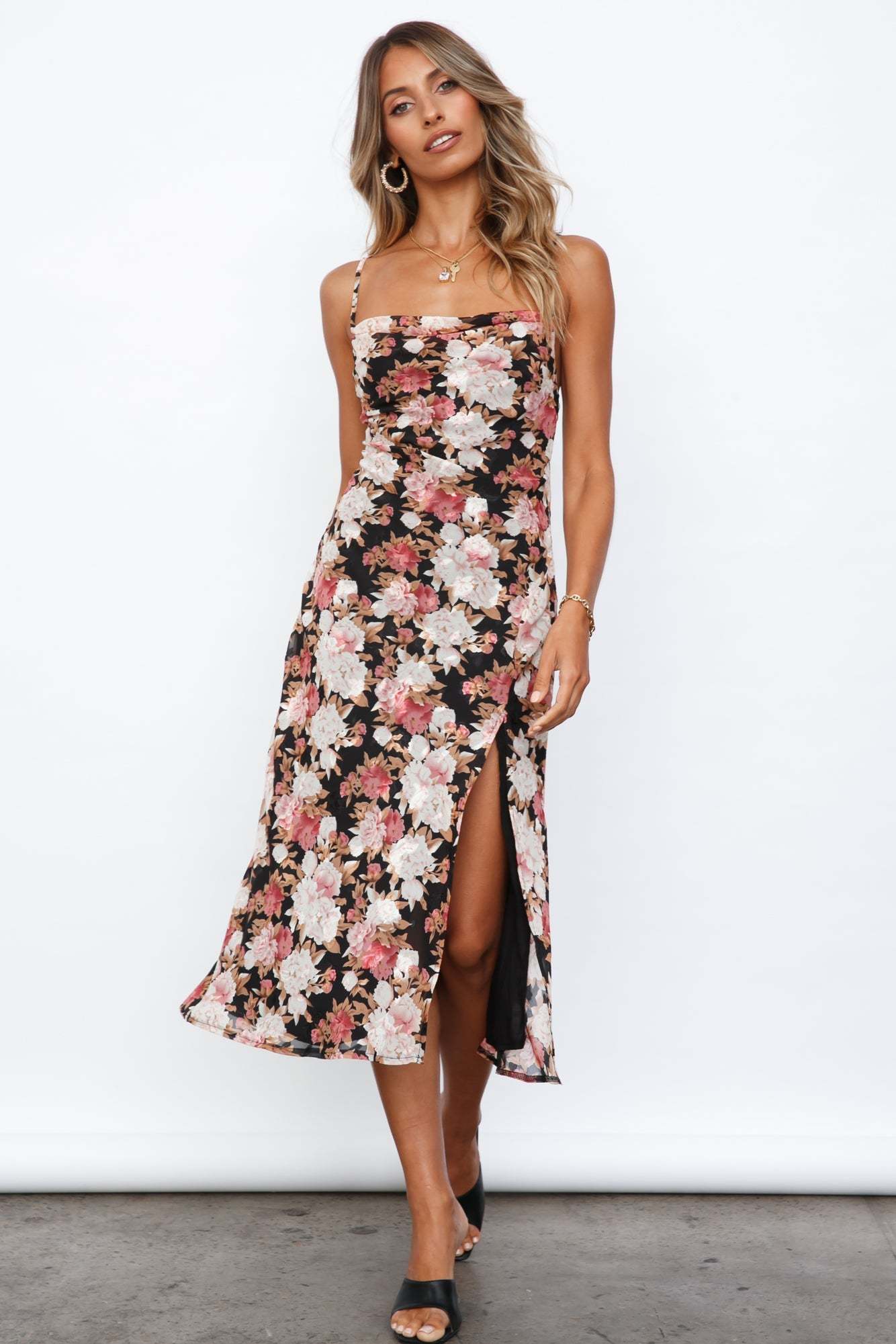 - Black. pink print midi dress.