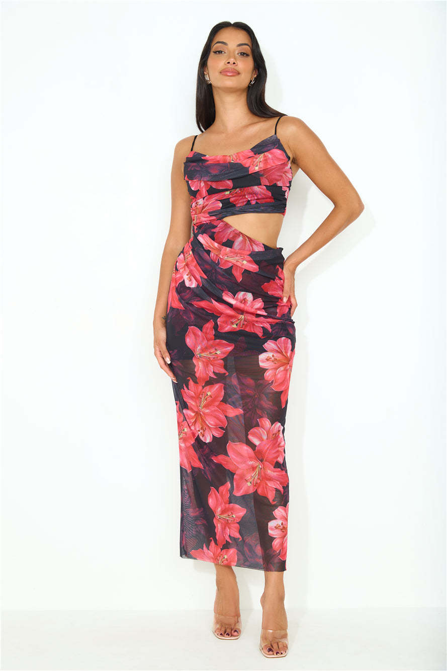Be seen and admired! The Wild Lily Mesh Maxi Dress features a cutout to the waist. elastic cord straps and a gorgeous floral print. Style with heels for a 'fit we love.