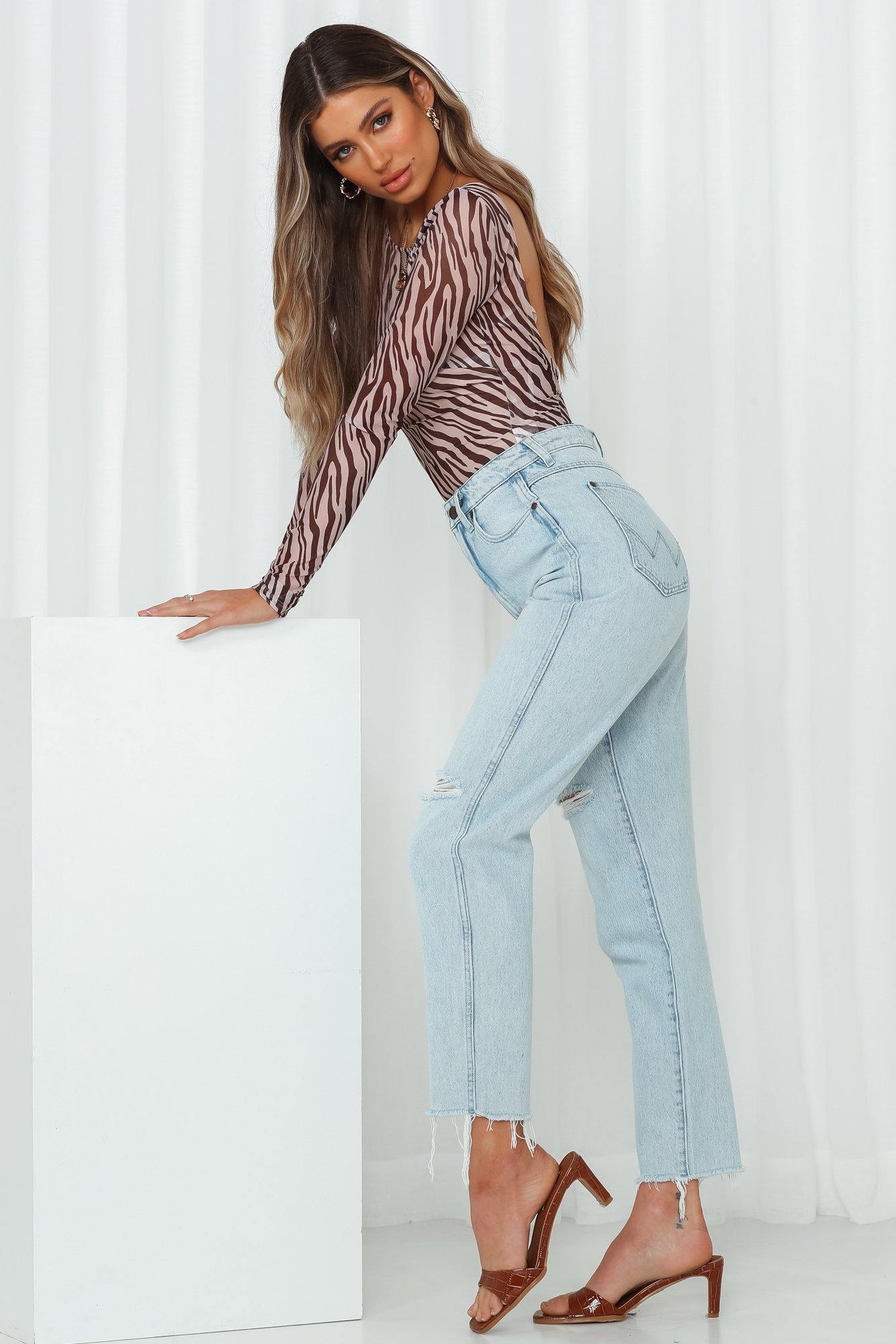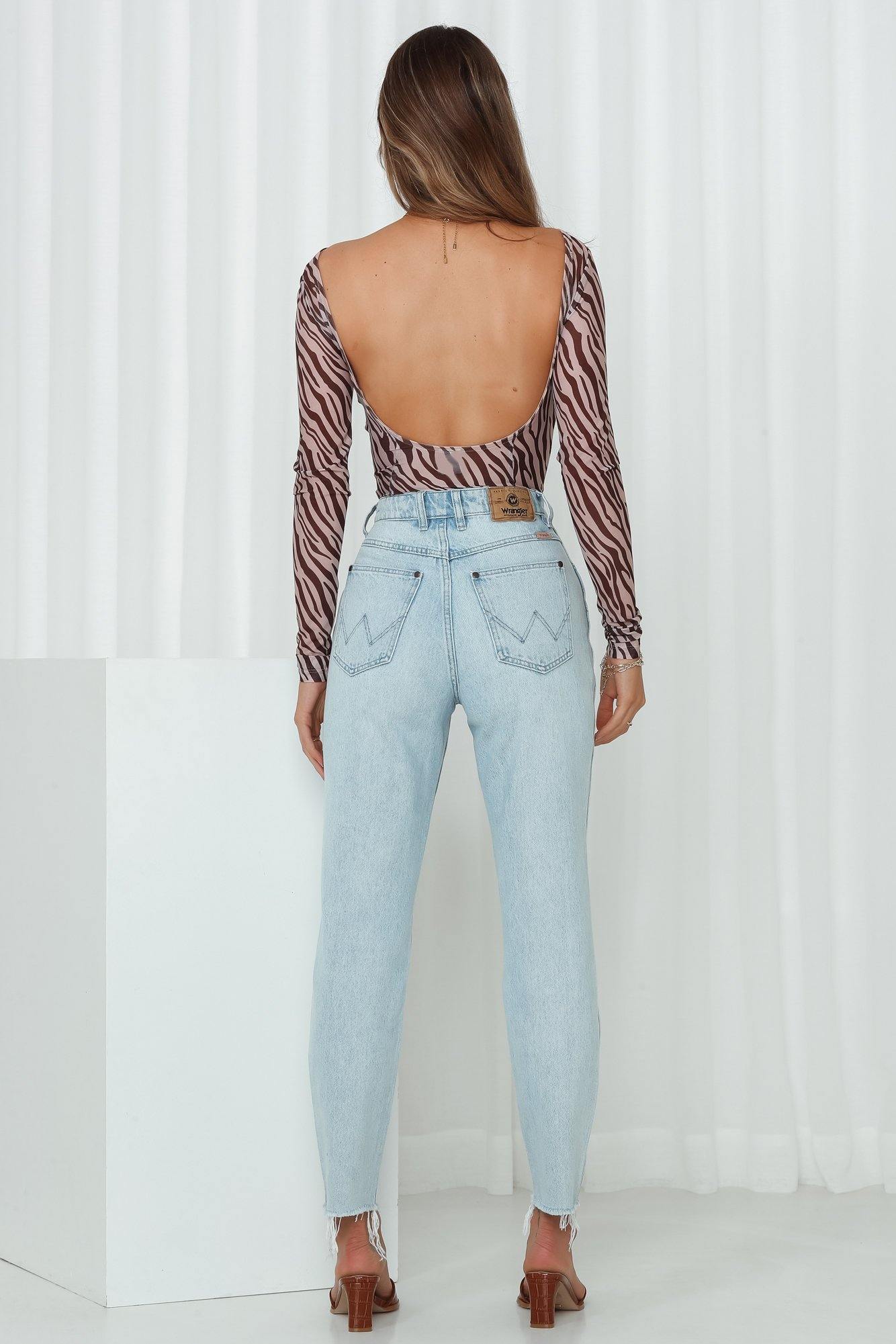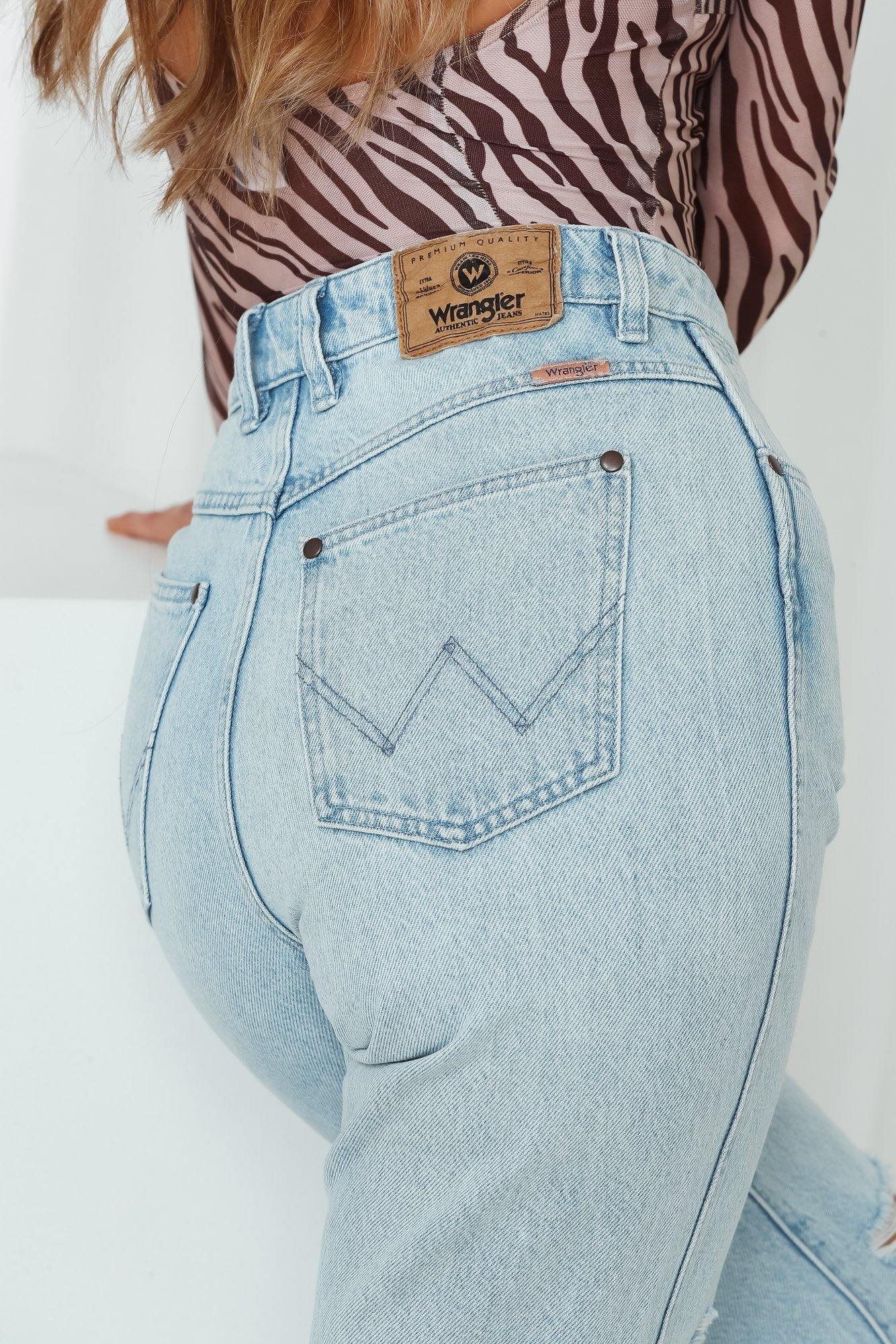 Designed to cater to all corners of your casual edit. Wrangler's Drew Jeans are the perfect essential to step up your transeasonal edit. Made with durable BCI cotton. the medium wash denim jeans feature a cropped mom-style fit. feature a high-waist with belt-loops and distressed detailing to the knee and leg cuffs. We've styled it with an animal print bodysuit and mules!